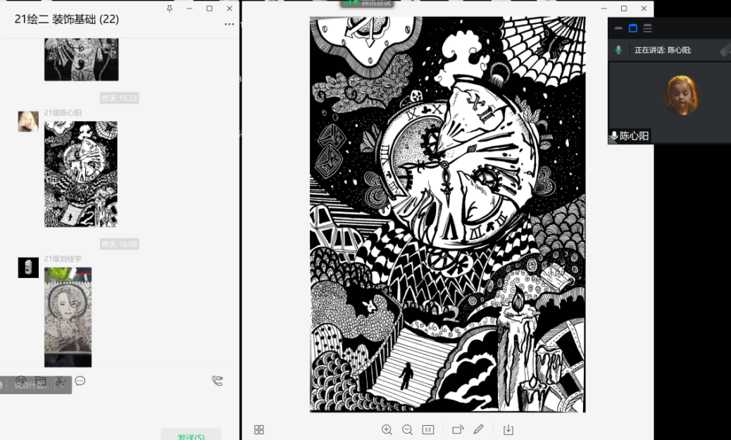 因为疫情的原因,我们的课是在网络上进行的,通过这节课上樊老师和丁老师的讲解和耐心的修改,我们积累了一些画作品的经验,从先前不会思考作品的构图黑白色彩到能自己理解作品的内涵,创作能力提高了,画画的时候也会更多的思考了。