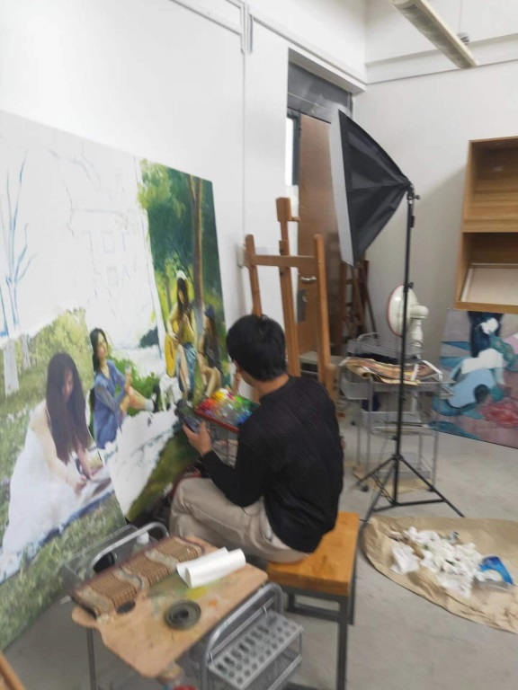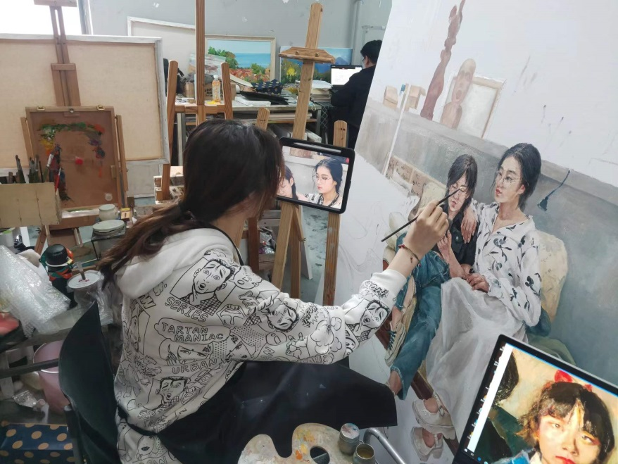 针对“内容”的问题,本课程秉承“思政+艺术”的教学理念,关注作品立意的文化品味、人文内涵,从身边入手、从细节出发,注重艺术语言表达的丰富、个性语言的抒发,从校内探查校外、从“云端”投视社会,立足现实、体味生活。在教师的引导下,每位同学均根据自身创作经验与日常关注的群体以及对艺术、对生活的理解,选择想要表达的题材与主题,其中有的通过描绘自己身边的人或事,表现当代社会的美好生活与风貌,有的通过表现农民或工人的劳作场景表达对当下劳动人民的关注与感情,有的通过再现自己家乡富有特色的民俗活动表现对非物质文化遗产保护的探寻与关切。