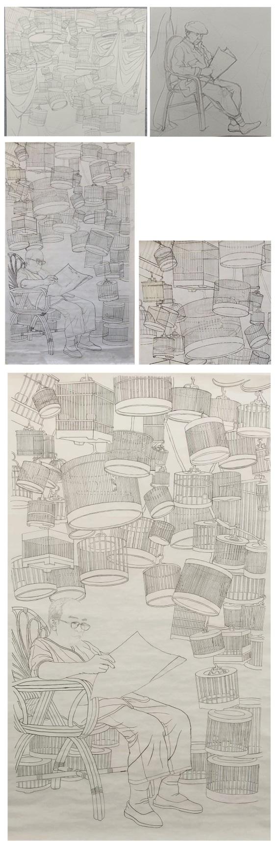 这次创作的是一幅纯线描的作品,这幅作品我用了大量的鸟笼和一个坐在竹编椅子上看报纸的老人,来展现出一种闲适安逸的氛围。运用鸟笼的和空白处的白来做繁简对比。这次的图式研究与创造课,给我们的毕业创作打下了基础,让我们更好的去体会感受创作一幅作品的过程,丁雷老师和樊诚老师都及时帮助我们解决问题,给我们指导,给了我们很大的帮助。