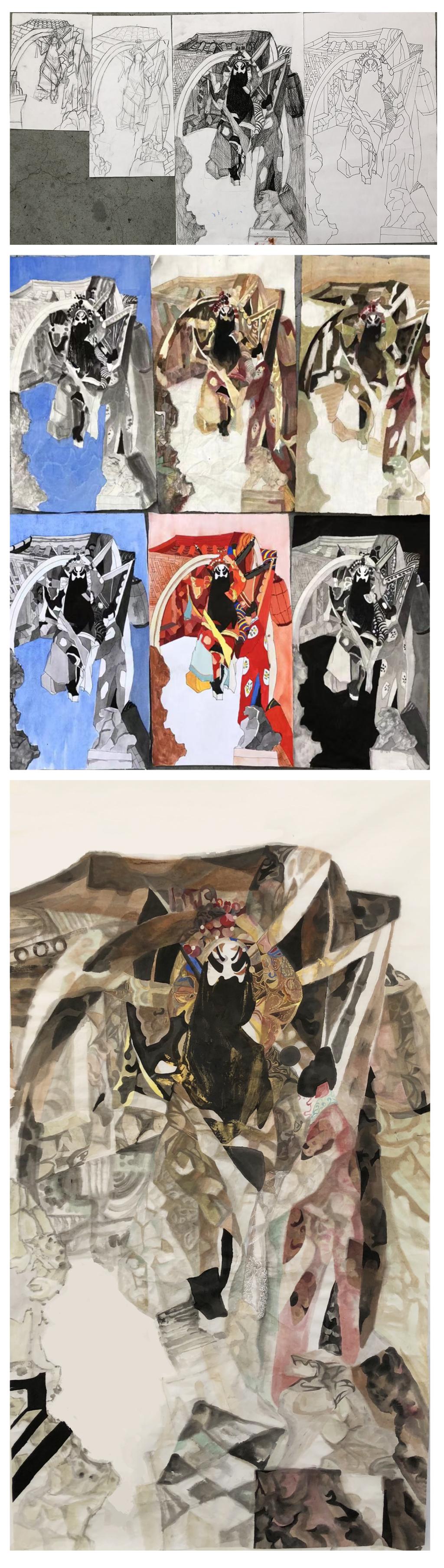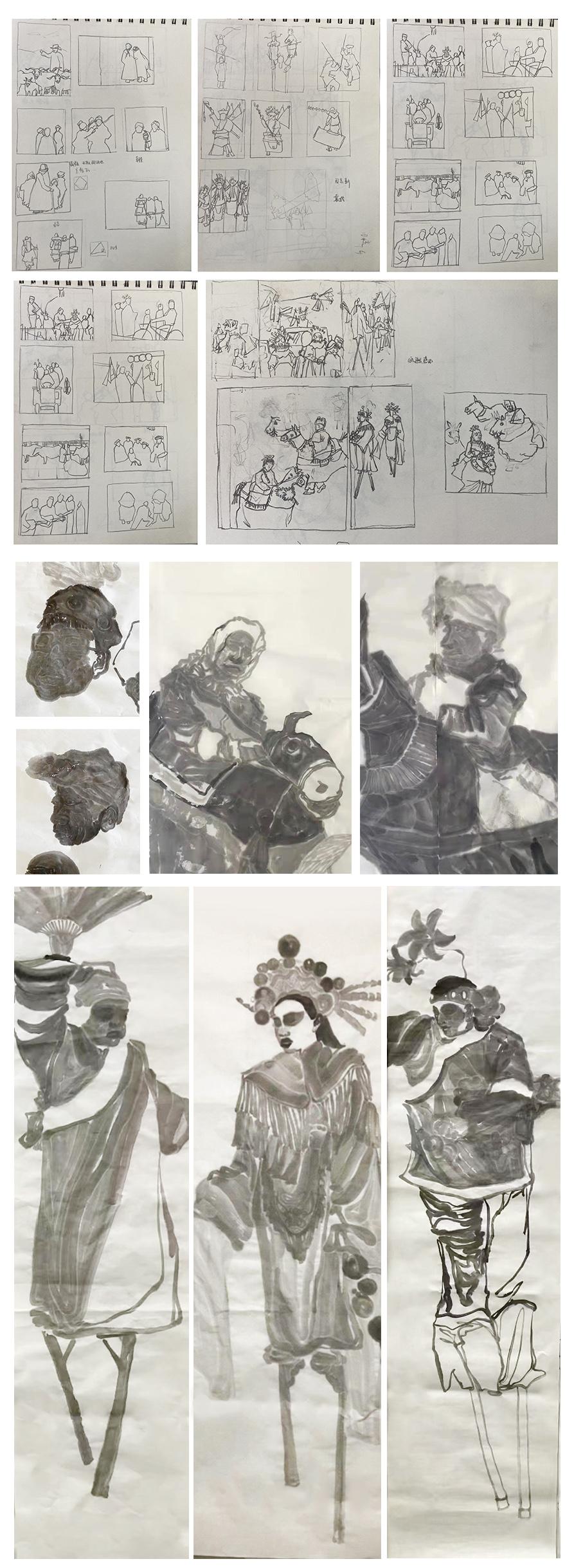 这次画的主题是以戏剧为题材,艺术源于生活,并高于生活。将现实世界中的人物形象与生活场景进行艺术加工,将现实的实物转化成艺术的图示拼接。将水墨效果以平面化进行处理。