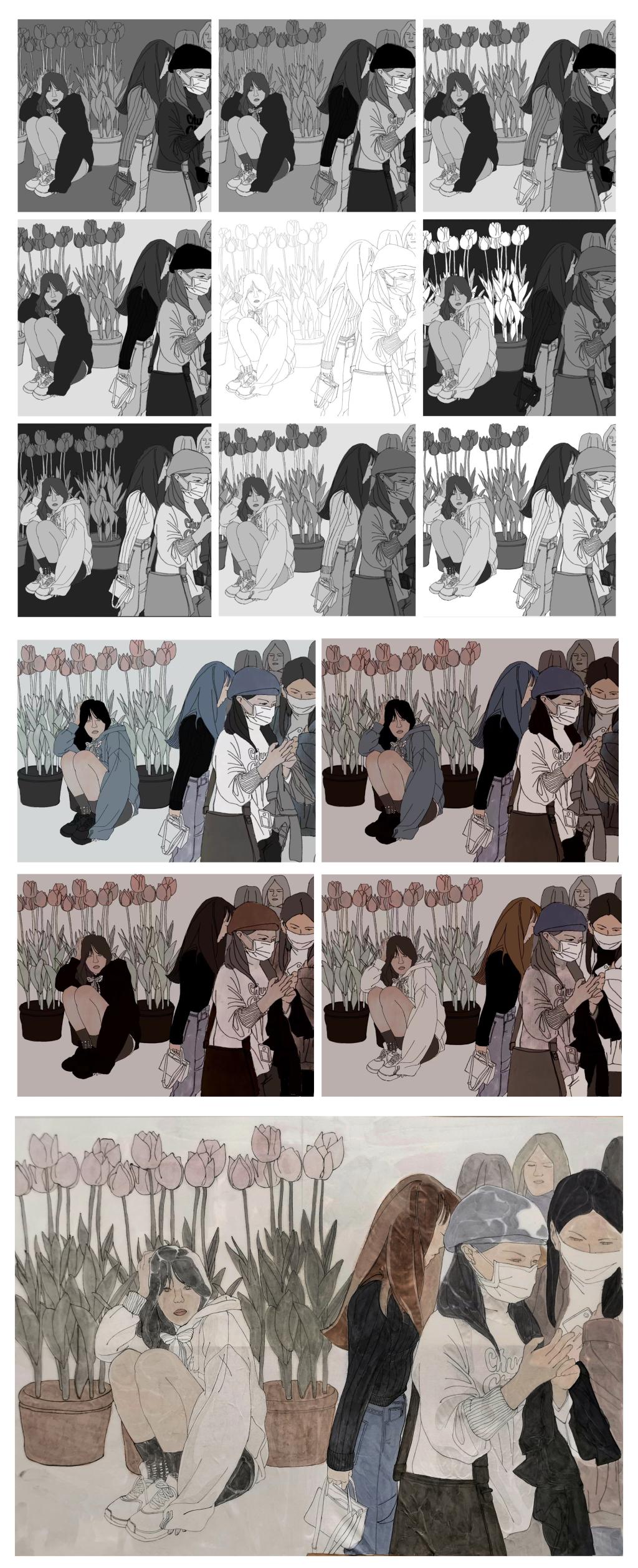 构思这幅作品时是三月初,节气正是惊蛰,“春雷响,万物长”,对于一个国家来说儿童最能代表这种朝气蓬勃的生命力,所以我构思出了一群小孩子玩耍的画面,与节气惊蛰相互呼应。