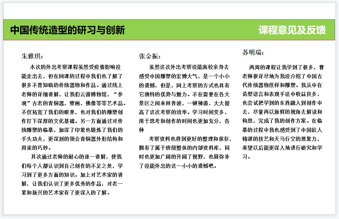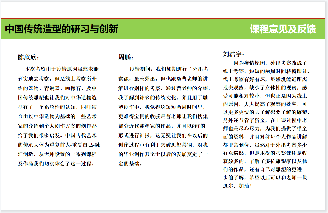 根据课程反馈情况来看,同学们都收获满满。衷心希望同学们通过本次课程能够将中国古代雕塑艺术中的传统精华与各种处理手法,运用于今后的艺术学习与雕塑创作之中,保持和发扬雕塑创作中的民族风格与民族精神,为实现中华优秀传统文化创造性转化、创新性发展贡献年青力量。
