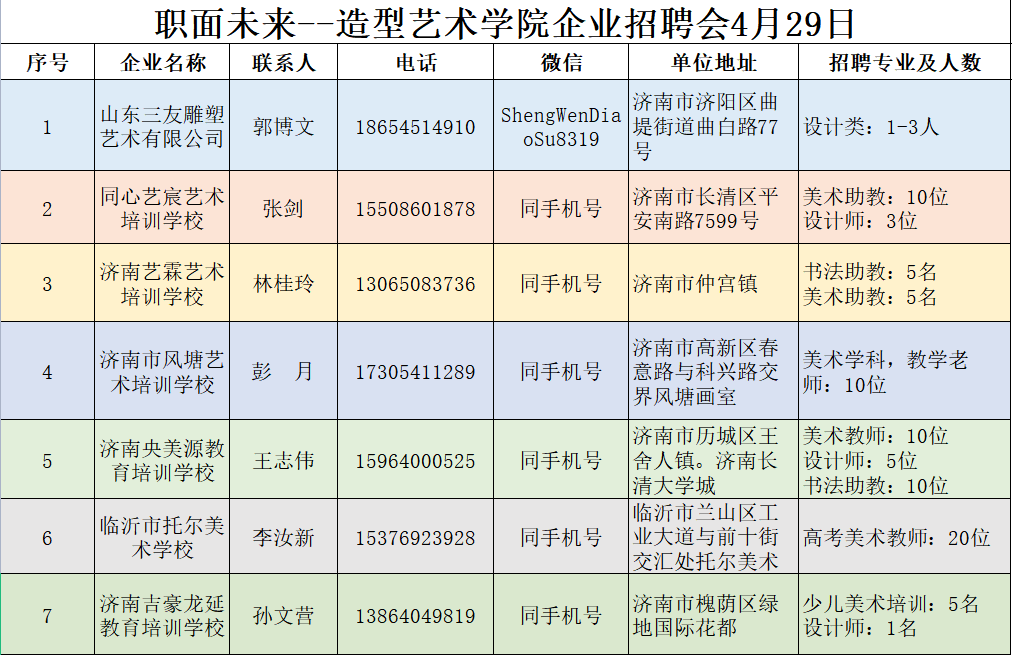 参加本次线上招聘会的企业单位分别是山东三友雕塑艺术有限公司、同心艺宸艺术培训学校、济南艺霖艺术培训学校、济南市风塘艺术培训学校、济南央美源教育培训学校、临沂市托尔美术学校和济南吉豪龙延教育培训学校。参会的企业单位主要招聘美术、书法、设计三大类专业,完全符合造型艺术学院的专业要求。