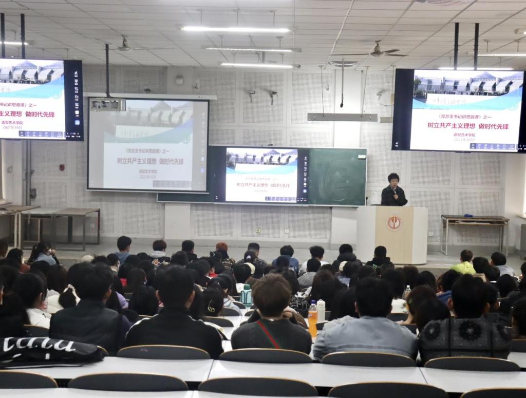 根据学校要求和统一部署,党总支书记每学期要为学生讲授思政课。2021年10月25日,造型艺术学院党总支书记牛序茜在第一合堂教室给全体2021级学生讲授了一堂思政课。