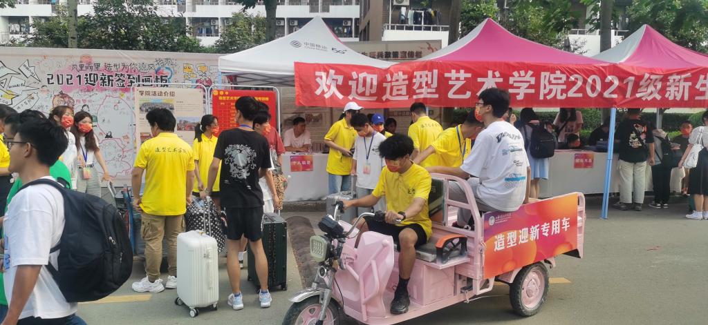 为了迎新工作更高效,上午6点,造型艺术学院的迎新志愿者们在长清校区十字路口集合,为2021级新生入学报到的工作展开进行充分准备。造型艺术学院的志愿者统一了服装和口罩,以求给新生展现更好的造型风貌。志愿者租借了电动三轮车以及板车,使行李搬运更加方便高效。学校西南门外,2021级新生在志愿者的引导下进入校园,来自外省的新生先后扫码准备进行核酸检测,设计师广场旁的核酸检测点队伍秩序井然。完成核酸检测的省外新生,在志愿者引领下到本院迎新点登记签到,进行相关资料证件的提交和领取。13日,省内新生在志愿者引导下直接到达迎新登记点,登记报到、提交档案、领取校园卡以及其他校园用品和生活贴士。我院在十字路口准备了新生专属迎新绘画签名板并设有专人拍照,让新生可以在学校留下最初的印记。