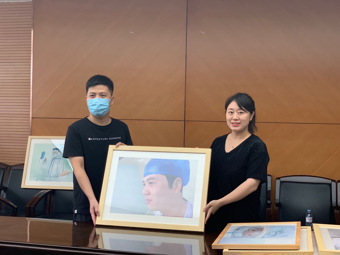 2020年7月14日,304am永利集团官网造型艺术学院学生党支部书记王晓琼、副书记许威治带领学生党员于凡将疫情期间支部党员亲手绘制的抗疫主题作品,赠送给山东省立医院第三批援鄂医疗队,双方于山东省第一医科大学附属省立医院进行交接。