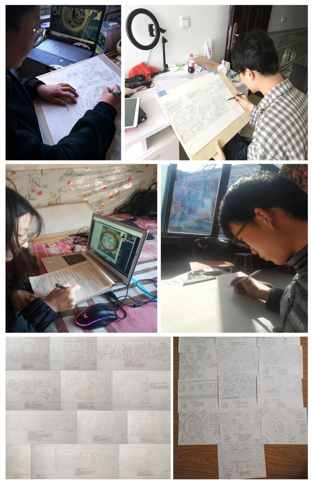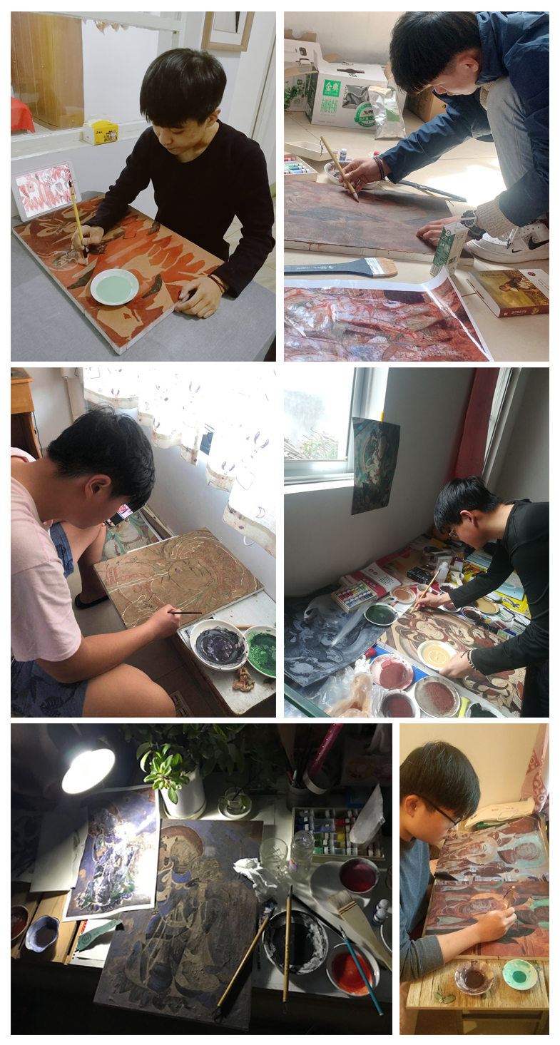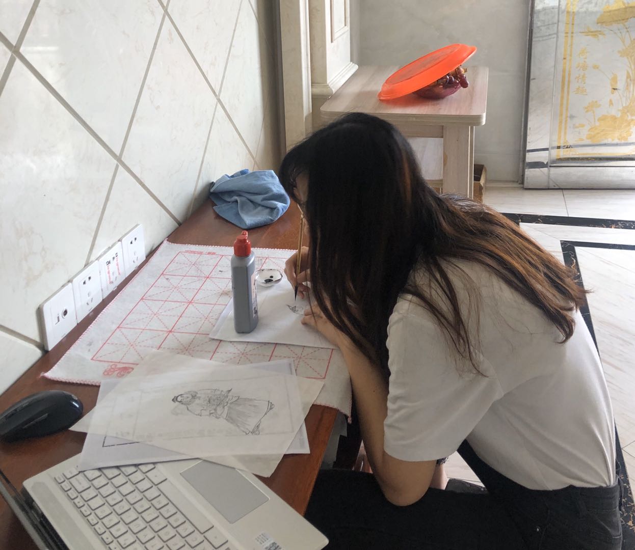 每天学生都会把作品绘制过程拍照发到群里,我会带着大家一起分析和讨论每幅作品的优点并指出作品需要修改和调整的地方。学生学习积极性高,态度认真,虽然在制作过程中偶尔会出现意想不到的状况,如底板开裂、脱落,但学生都能够用积极的态度去克服困难,利用课下时间重新制作。课后在绘制过程中出现问题,学生都会在微信上及时和我沟通,以实现解疑答惑跟进指导的效果。