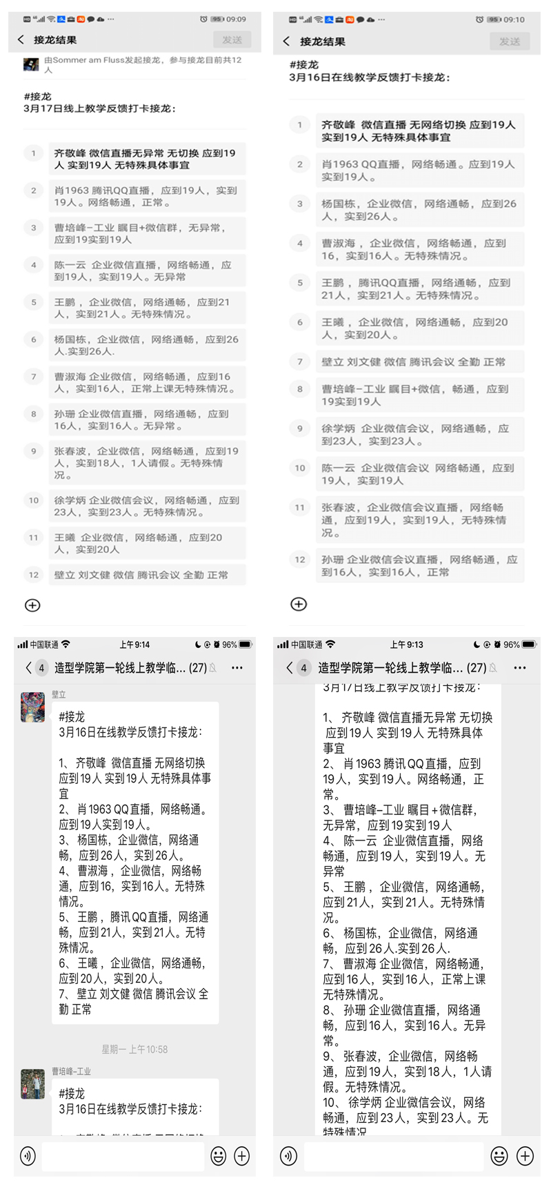 为扎实推进线上教学,遵循“标准不降、形式多样、方式灵活、强调效果、保证质量”的原则,自开学之日起,由院领导、教授、教研室主任、教学秘书组成督导小组,,全面参与质量监控,准确分析质量数据,及时反馈质量信息,本周线上听课7,督查线上教学的进度、内容、效果和质量,及时收集能反映教学质量的信息,与授课老师及时沟通交流,并将自己的丰富教学经验分享给年轻老师,有力的推动教学工作的进行。线上课堂多采用启发式教学,活跃课堂的气氛,增强学生参与感,全面掌握教学活动开展情况。“非常时期”的“非常课堂”期待同学们拿出好的作品,期待线上教学取得优异成绩。