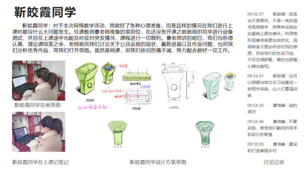 为适应线上教学需要,也为了适应产品专业与公共艺术专业在课程教学内容中侧重点不同,在专业理论教学和设计实践教学中做了微调。在保证原有知识点不变的情况下,取消了市场调研、环境考察环节中集中走访、现场调研的教学模式,改为网络调研与模拟环境。充分利用网络资源充实课程内容;积极引导学生关注当下的实时热点问题与国计民生问题,开展在线设计。依据课程的设计实践要求,采用创新设计的方法,为同学们设定了两个创新设计方向。一是紧跟当下防疫热点,设计各类防疫设施,同时参与创作大赛,检验设计效果;二是助力美丽乡村建设,为了把家乡的村庄建设的更美好,同时为巩固脱贫效果,做好乡村公共设施的创新设计。