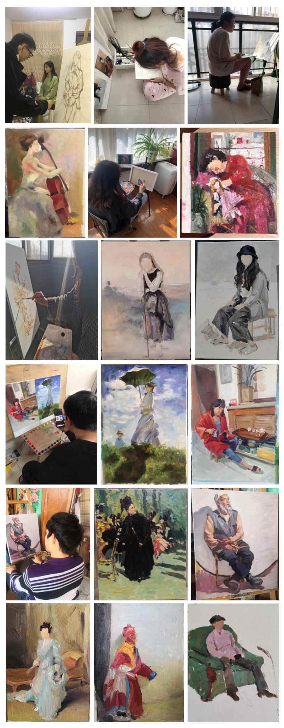 《油画全身像(带环境)》课程是油画专业重要的专业必修课,是一门侧重实践类的专业课程。在前期教学准备中,教师与教研室的老师们不断地的共同商讨制定,在防疫特殊时期的网络在线教学中,该课程将由从教室面对面、手把手的实践型教学,向理论与实践并重、临摹并发展创作理念带动写生实践的教学思路进行转变。