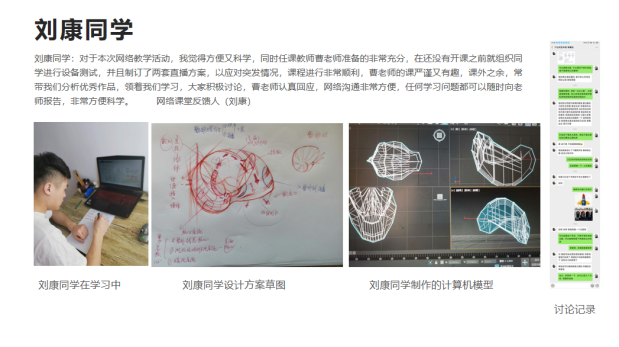 在线课堂内容的理论讲授与传统课堂理论讲授相比较,线上课程在直播的过程中可以实时与同学互动交流,线上课程资源丰富,能够扩展同学们的知识点,随时可以进行网络查询,学生认知和理解的内容更多。传统课堂的优势在于教师可以用适当的肢体语言配合讲授的语气,能够准确、深入的讲述设计意图。线上教学不足的地方在于线上课程对学生的学习自觉程度要求较高,老师的监督能否有效的转化成学生的学习效率,也需要通过其它手段进一步探索。