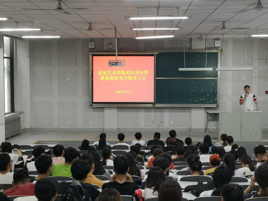 为加强期末考试的考风考纪教育,同时确保学生合理规划并顺利渡过暑假,7月3日下午,造型艺术学院于综合教学楼四合堂为2016级、2017级及2018级学生召开考风考纪暨暑期安全教育大会。大会分别由造型艺术学院党总支副书记杜鹏和辅导员许威治主持,2016级、2017级及2018级全体学生参加。