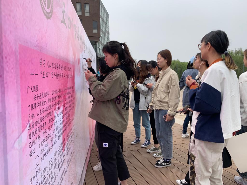 4月12日中午,团总支在长清校区设计师广场开展“学习《山东省学校安全条例》签名活动”,号召全校范围内的团员青年认真学习安全条例,树立安全防范意识,共同和谐校园。签名活动受到广大团员的欢迎,大家认真阅读倡议书,在签名墙签下自己的名字。