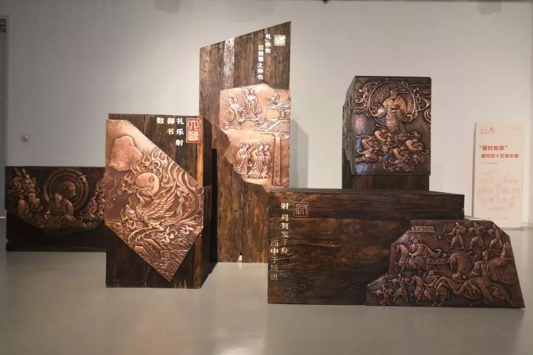 作品创作中注重对中国传统文化的传承与创新。学院集体创作作品《六艺》(壁画)实现了对中国优秀传统文化的传承与发展,六艺是指礼、乐、射、御、书、数,它是中国优秀传统文化教育的重要组成部分,以六艺做壁画创作题材,一是对中国优秀传统文化的传承与传播;二是对习近平总书记提出的“文化自信”的具体实践。作品用简练的装饰造型手法,以精湛的锻铜浮雕工艺把六艺的文化内涵用图像的形式展示出来;在壁画的表现形式上突破传统壁画以建筑墙面为传播媒介,而以物体的表面做为媒介,可以让观者从多方位、多角度观赏画面,是对传统壁画传播媒介表现形式的创新。