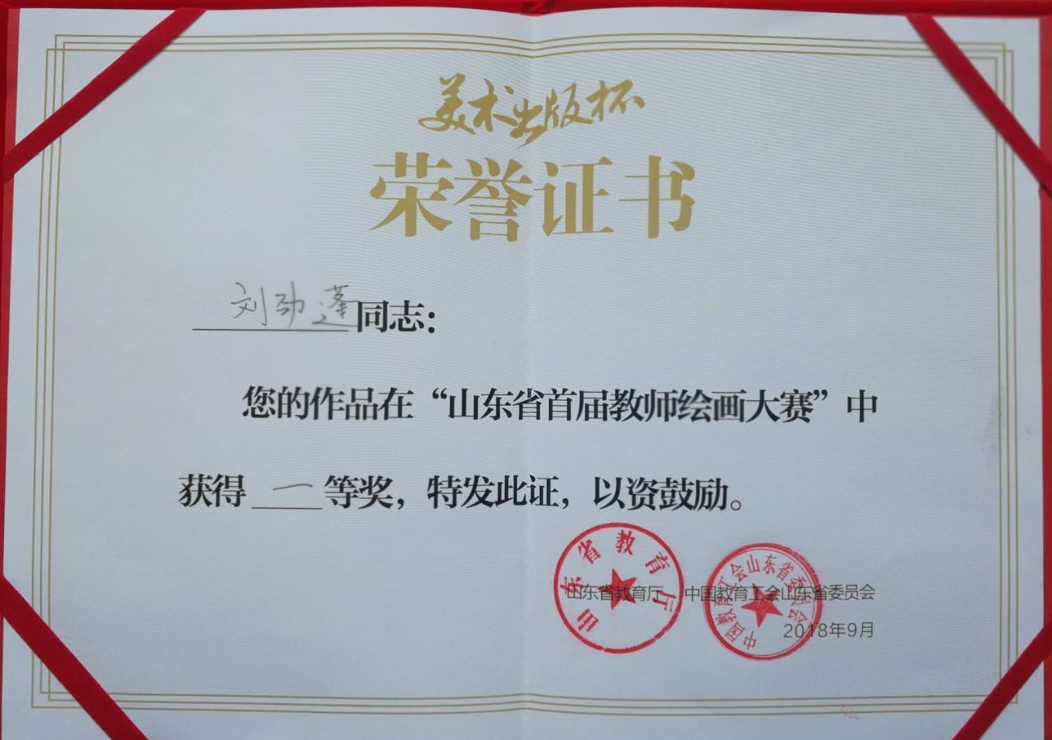 “美术出版杯——山东省首届教师绘画大赛”共收到参赛作品一千余件,经过专家委员会严格评审,评出一等奖16件,二等奖38件,三等奖72件。造型艺术学院教师刘劲蓬荣获一等奖,高振堂荣获三等奖。