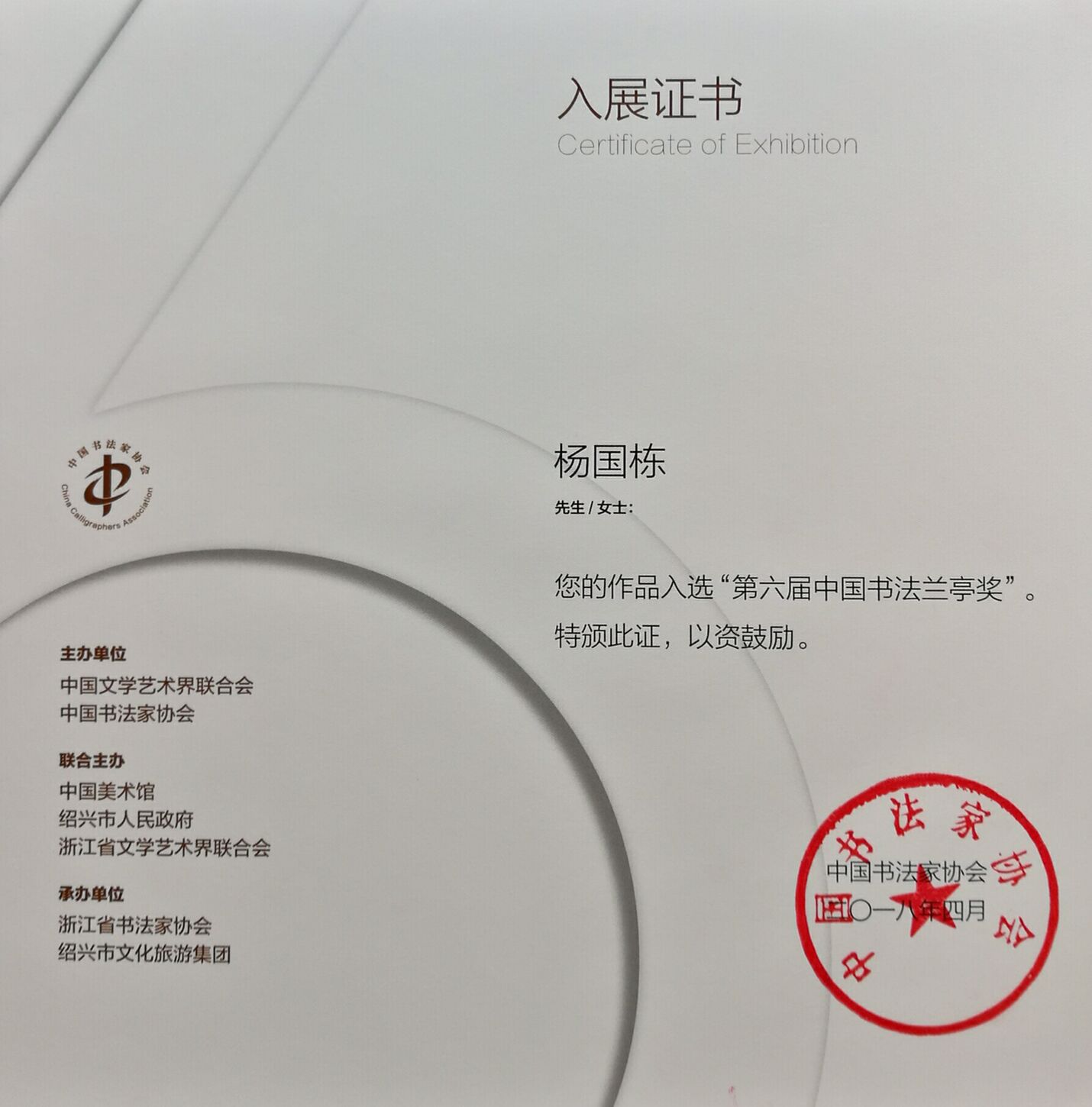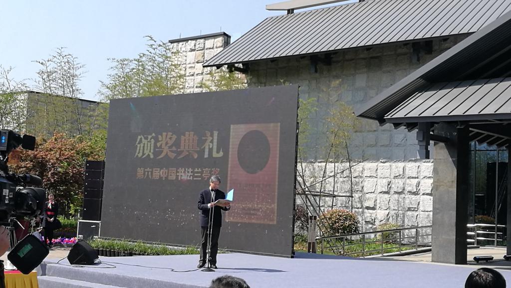 2018年4月18日上午,第六届中国书法兰亭奖在绍兴兰亭书法博物馆举行颁奖典礼。中国书法兰亭奖2001年经中宣部批准,由中国文学艺术界联合会、中国书法家协会主办的中国书法艺术最高奖,是18个国家级文艺奖项之一。它是授予在书法艺术创作、理论研究、书法教育、编辑出版等领域有重大成就和突出贡献的书法家、书法理论家、书法教育家和书法工作者的最高奖项和最高荣誉。与中国戏曲梅花奖、中国电影金鸡奖、中国电视金鹰奖一样,都是艺术门类的国家级最高奖。