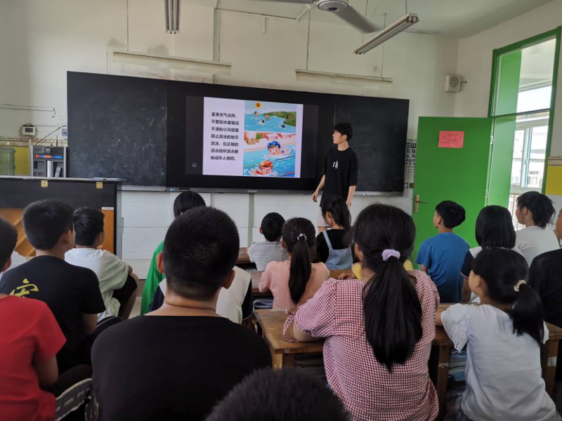 实践第一天,在不耽误老师们上课的前提下,我们利用教室多媒体设施,通过PPT和视频,向学生们展示了暑期常见的溺水、电信诈骗、霸凌等安全隐患,通过一个个鲜活的案例,让小学生们认识到身边的危险无处不在。接下来的几天,我们向学生们讲述了一旦发生同伴及自身溺水后应该如何救人与自救,讲述了电信诈骗常见手段以及预防手段,讲述了校园霸凌的形式以及如何求助老师和家长。再接下来的一天,我们在教师帮助下,引导小学生们在防溺水的条幅上签上自己的名字,希望引导他们能够进行自我承诺,增强自身安全信念和防范意识,争取做到心口如一。最后一天,我们还向学生们发放了防溺水和防电信诈骗的宣传页,并叮嘱孩子们回到家后,与家长一起分享,希望同步提高学生及家长的安全意识。