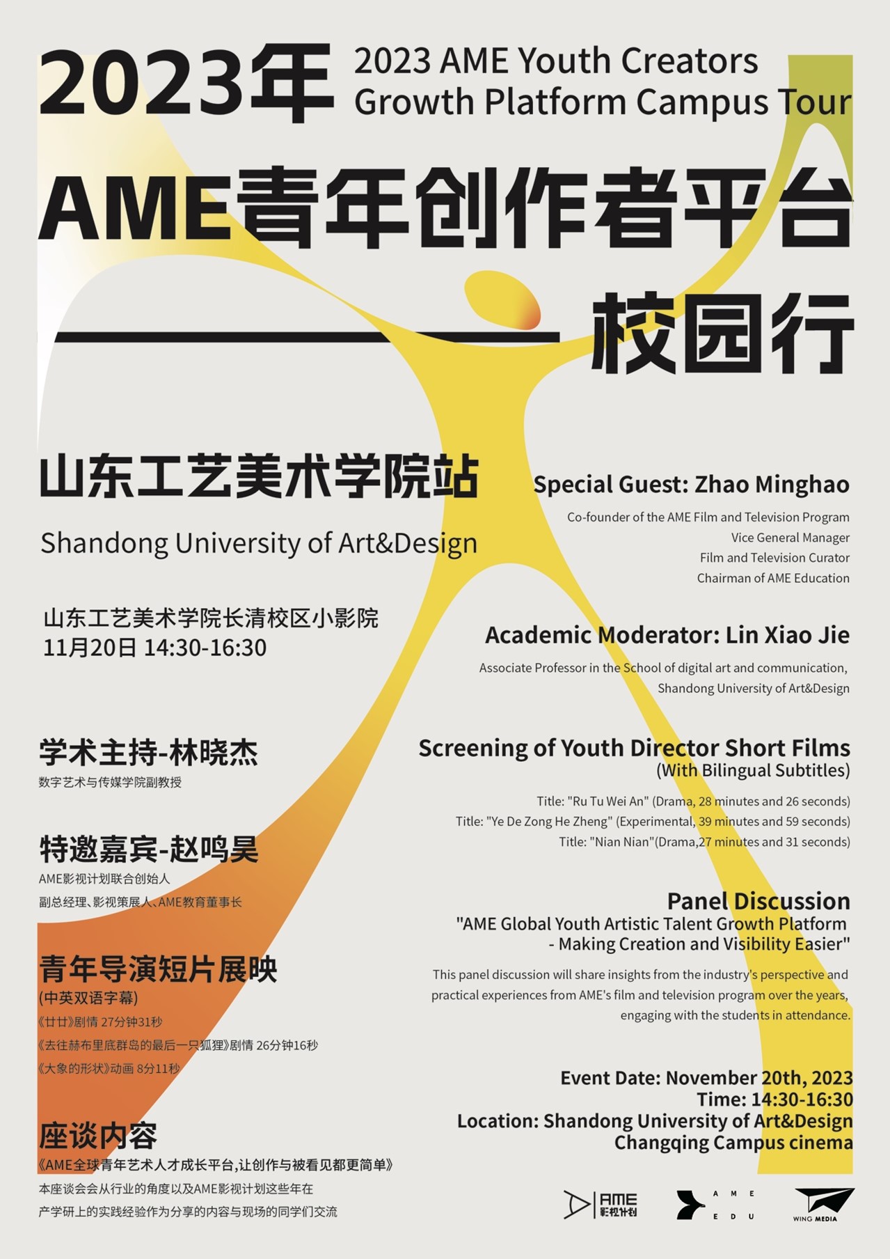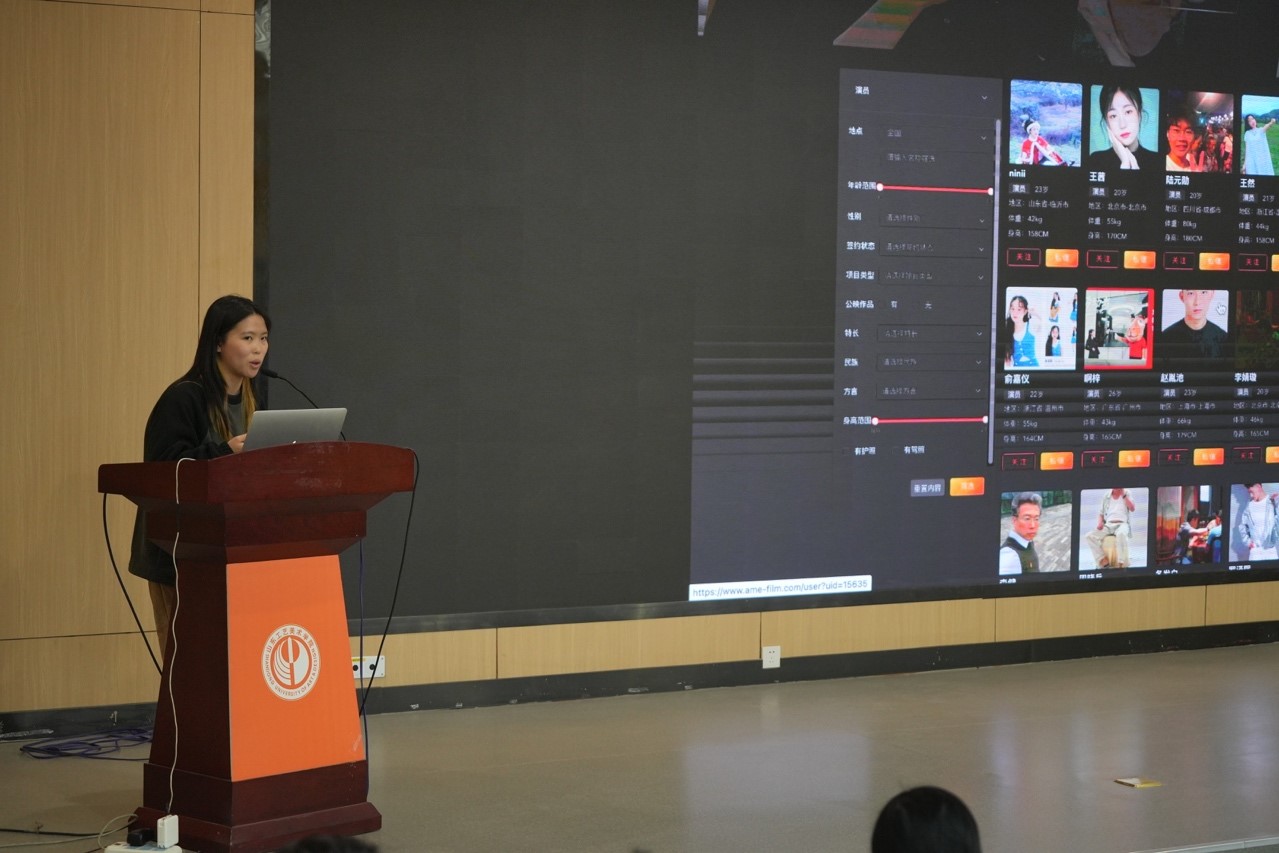 AME影视计划联合创始人赵鸣昊、AME社群运营负责人程丝婷、AME教育联合创始人张世鹏分别从影视行业的发展与就业、影视创作模式、影视人才的自我发展规划等方面与同学们进行了交流。
