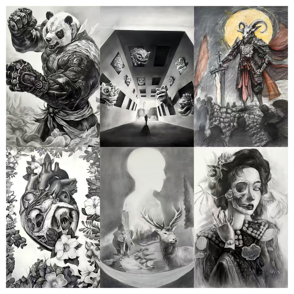 数字媒体艺术专业一直积极探索全新的教学方法以及科学合理的课程设置,旨在更好地适应时代的发展趋势与教学实际需求。创意素描和创意色彩课程作为数字媒体艺术专业的重要基础课程,向来备受高度重视。通过对这些课程的深入学习,学生们能够扎实掌握基本的绘画技巧以及色彩运用方法,与此同时,也可以有效地培养自身的创造力与审美能力。本次展览是该专业在教学实践中的一次大胆尝试,将 “创意素描” 与 “创意色彩” 进行深度融合,成功打通造型基础类课程的阶段性实践成果,为学生们精心打造了更加丰富多元、全面系统的艺术学习体验。