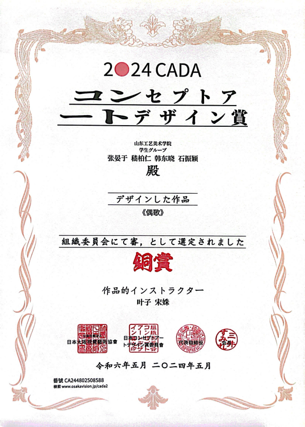 在刚刚落下帷幕的2024年度CADA日本概念艺术设计奖中,我院影视摄影与制作专业马睿骁、梁佳淼、温腾飞、张晏于同学的作品《汝意》;张晏于、嵇柏仁、韩东晓、石振颖同学的作品《偶歌》在众多参赛作品中脱颖而出,喜获铜奖,指导教师程思远、叶子、宋姝获优秀指导教师。