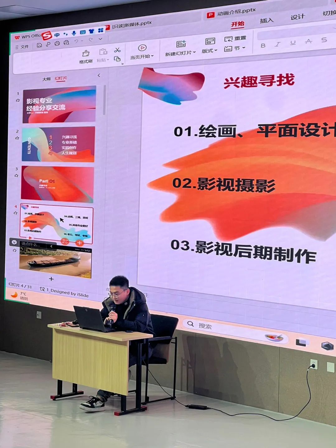 四位主讲同学分别来自动画、数字媒体艺术、新媒体艺术和影视摄影与制作等专业,他们基于自身大学期间学习成长的经验,从专业认知、课程设置、作业练习、拓展自学、成果展示等方面向新生分享了学习心得和学习方法。