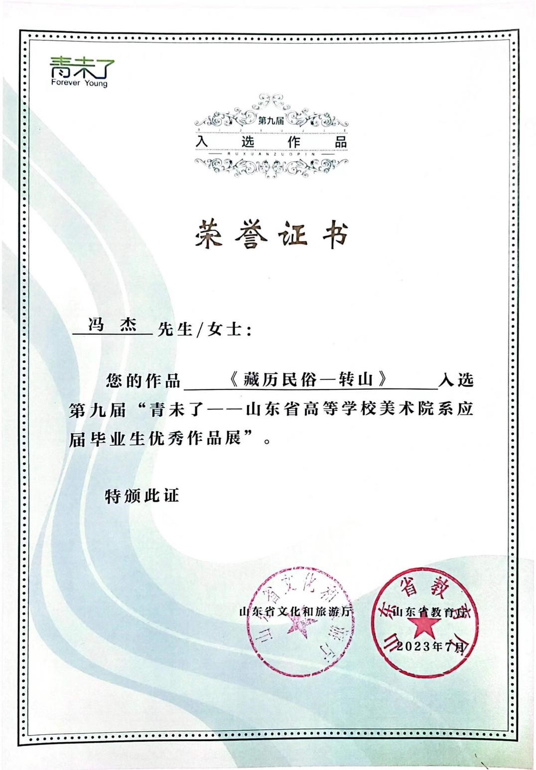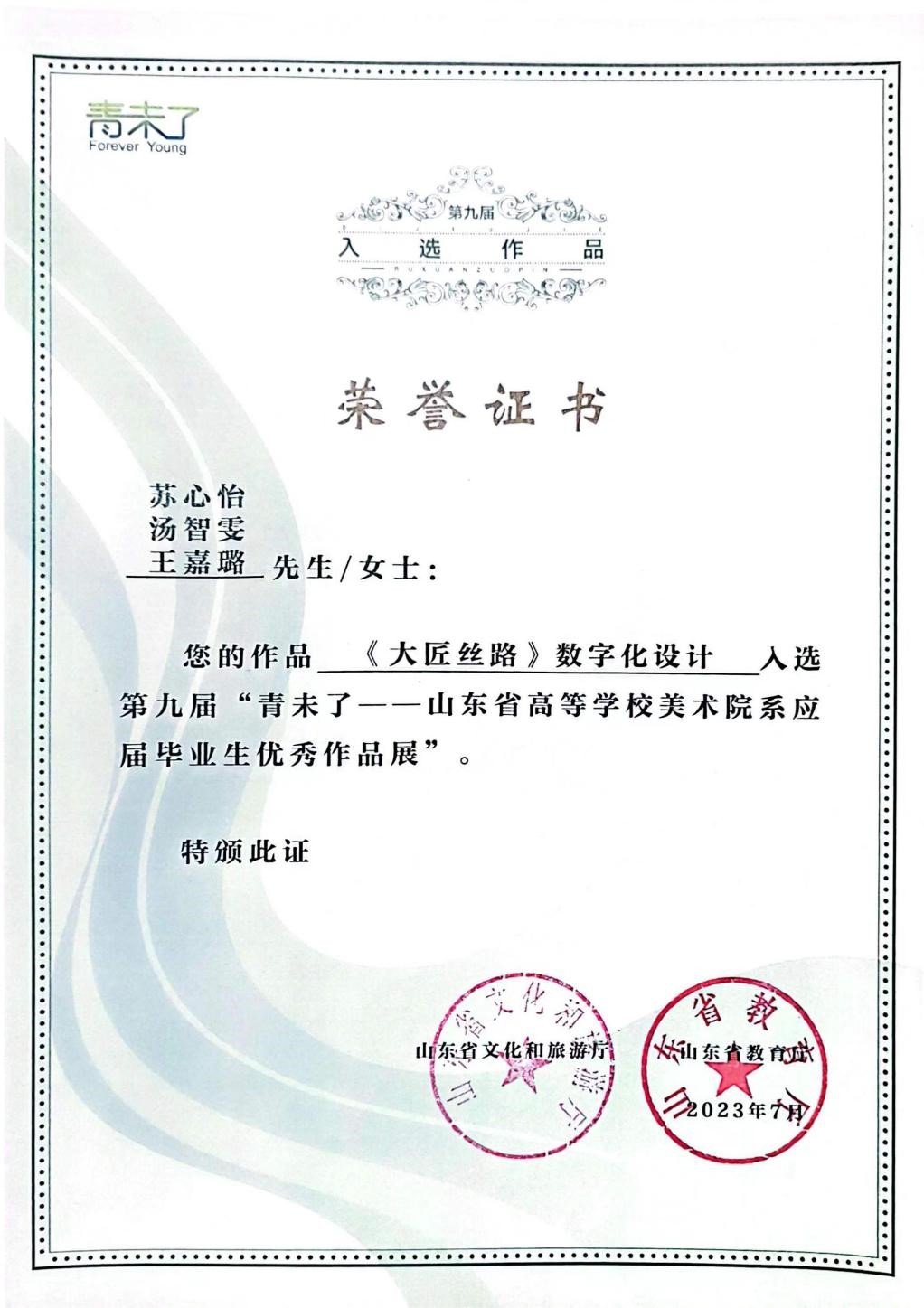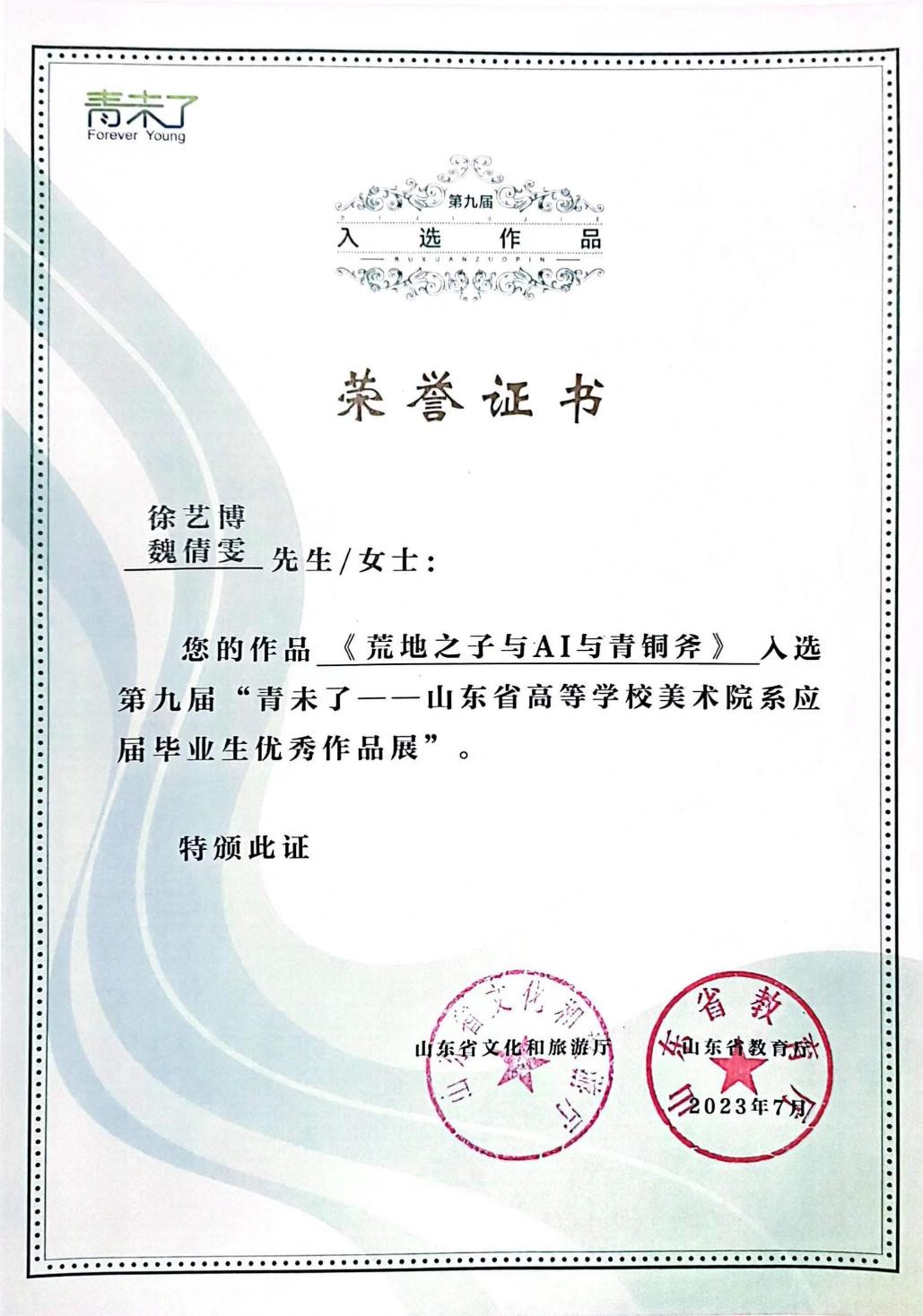 第九届“青未了——山东省高等学校美术院系应届毕业生优秀作品展”作品复评、评奖活动7月在山东美术馆成功举办。本届“青未了”共收到43所高校报送的有效作品457件。经严格评审,最终评出入选作品197件。我院23届毕业生作品《大匠丝路》数字化设计、《荒地之子与AI与青铜斧》、《藏历民俗——转山》等入选。