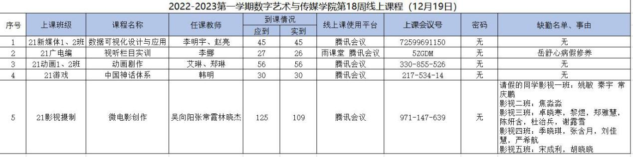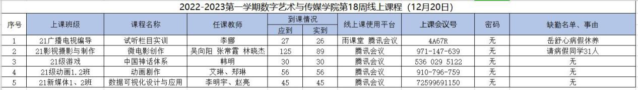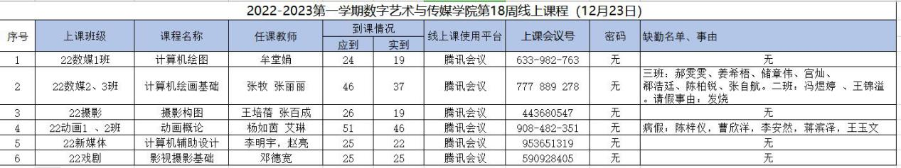 数字艺术与传媒学院线上教学工作进入第五周,本周也是21级和22级课程的最后一周。在总结前四周的工作经验基础上,各项工作稳步推进,有序运行,现将本周教学情况汇报如下。
