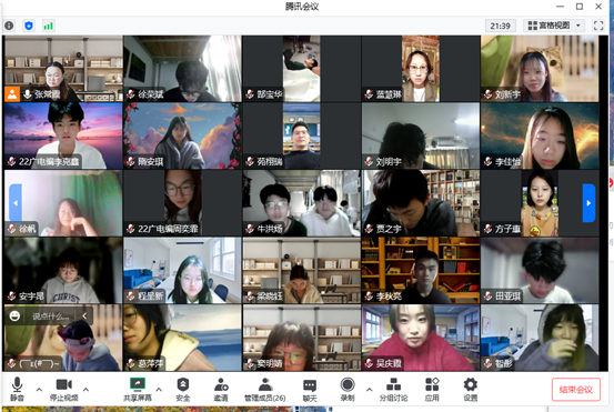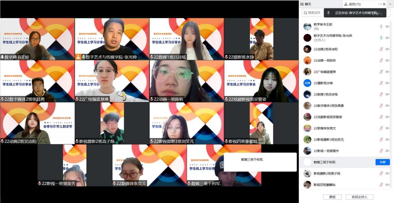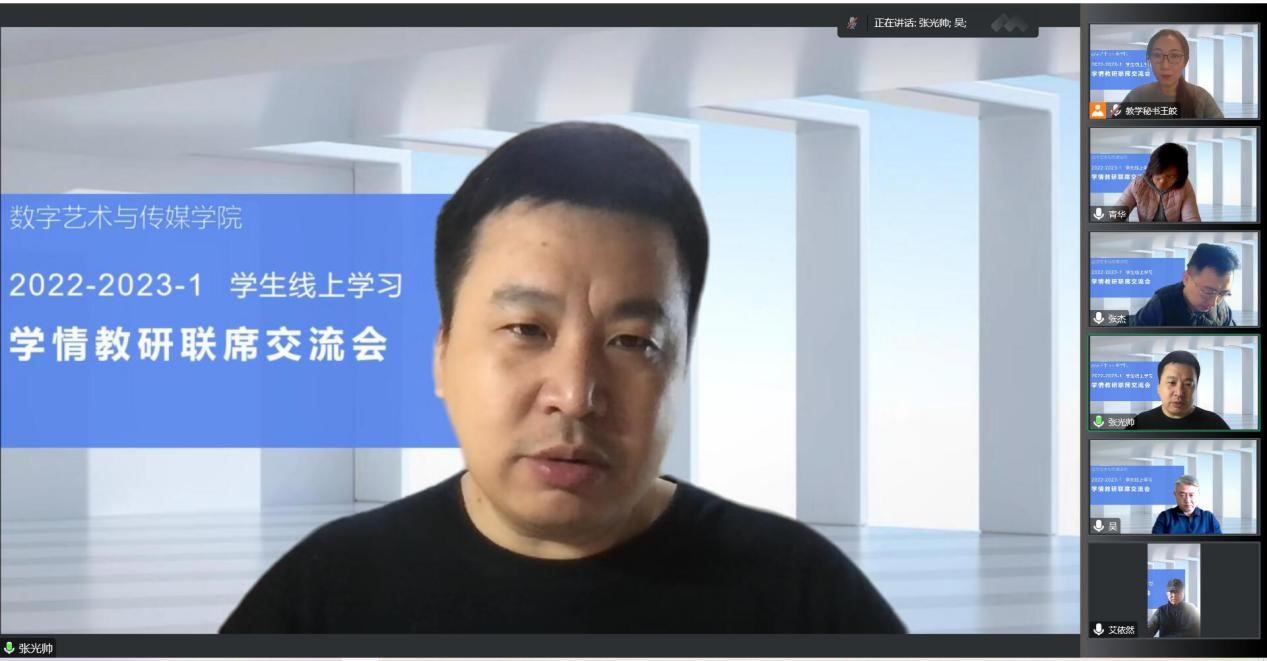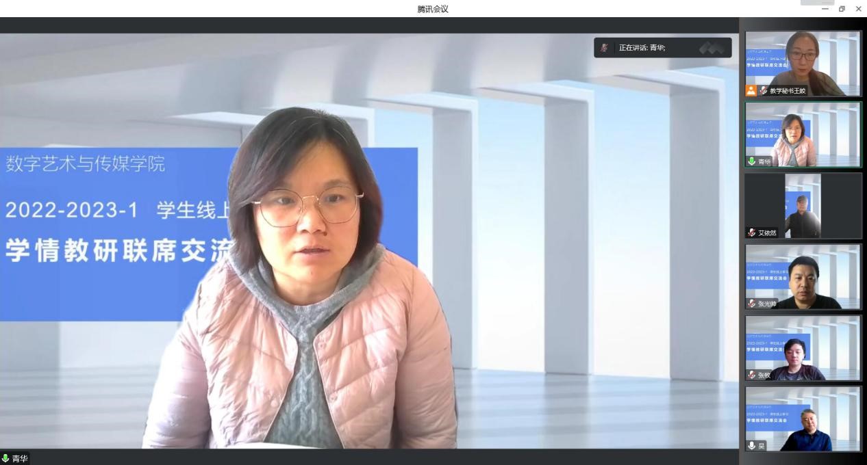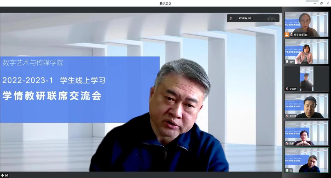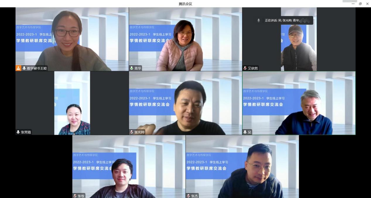 12月18日,数字艺术与传媒学院院长吴向阳、党总支书记李清华、副院长张光帅、教学秘书王皎及各教研室主任在腾讯会议举办线上“学情教研联系交流会”。