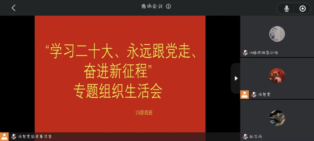 为深入学习贯彻党的二十大精神,更好地教育引导广大共青团员听党话、跟党走,大力弘扬以爱国主义为核心的中华民族伟大精神,数字艺术与传媒学院各团支部于12月2日线上开展“学习二十大、永远跟党走、奋斗新征程”专题组织生活会,会议由各支部书记主持,支部团员积极参加。