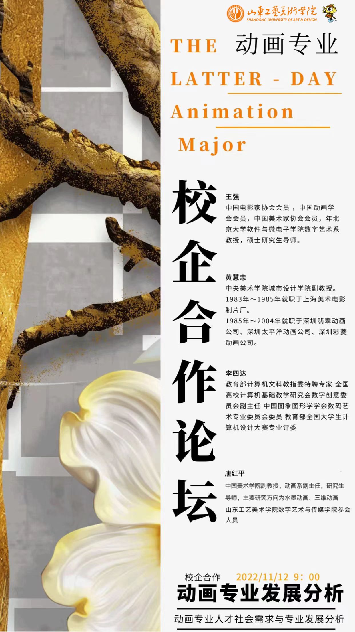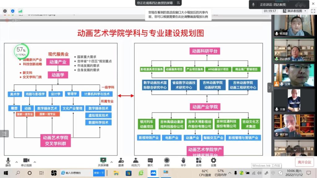 2022年11月12日上午数字艺术与传媒学院线上召开动画专业人才社会需求与专业发展分析校企合作研讨会,与会专家邀请了北京大学软件与微电子学院数字艺术系王强教授、教育部计算机文科教指委特聘专家北京服装学院李四达教授、中央美术学院城市设计学院动画系教研室黄惠忠副教授和中国美术学院动画系副主任唐红平副教授。