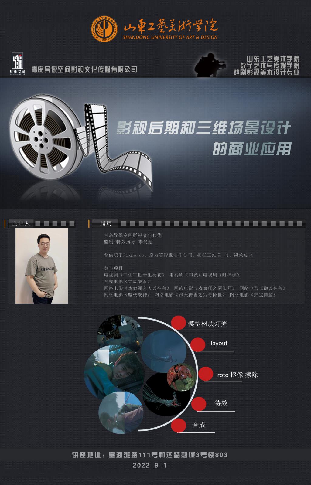 讲座伊始,侯总监介绍了影视行业现状、前景及国家对青岛影视产业的相关帮扶政策。紧接着由视效总监李光超和技术总监赵伟华就公司的具体业务内容及行业状态展开介绍。展示了公司参与制作过的影视项目、动画项目,绿幕特效合成的数字摄影棚技术及基本制作过程,还提到本专业在行业中起到的作用与就业前景。