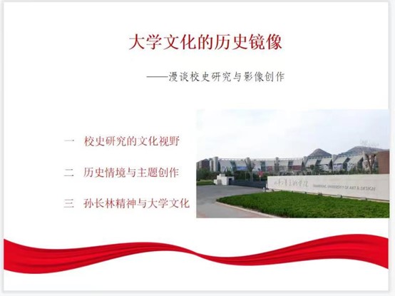 王任老师以多年校史研究的经验、心得和思考为基础,拉开了本次讲座的序幕。讲座注重历史情境和以图证史,从校史研究的文化视野、历史情境与主题创作和孙长林精神以及大学文化三个方面展开,给同学们精细的梳理了建校以来学校历史的发展脉络和各个阶段发生的重要代表性事件,并期待同学们积极参与校园文化的影像记录和艺术表达。