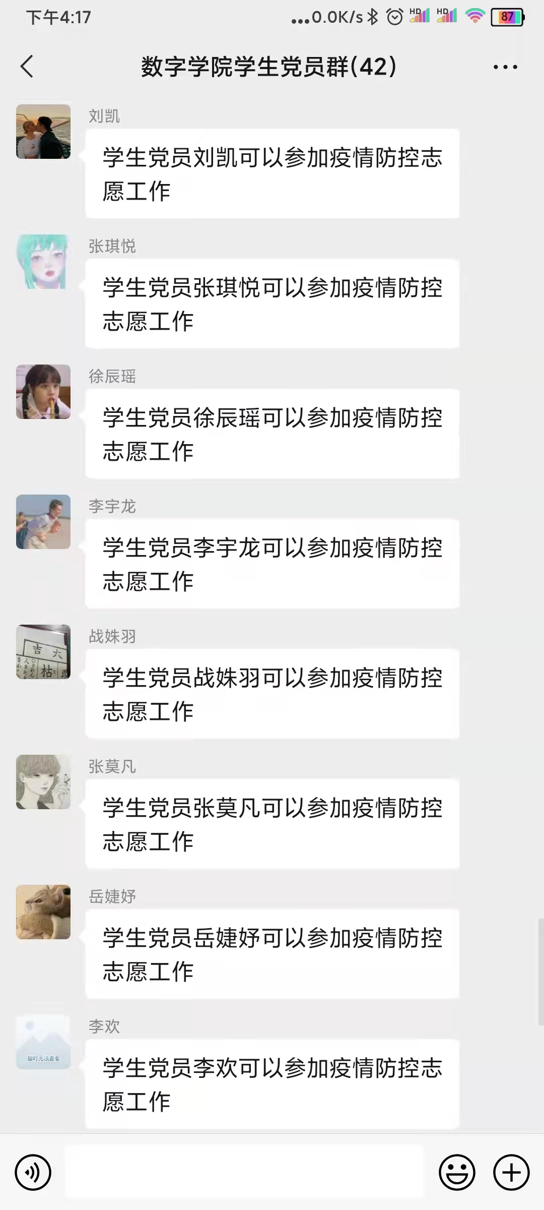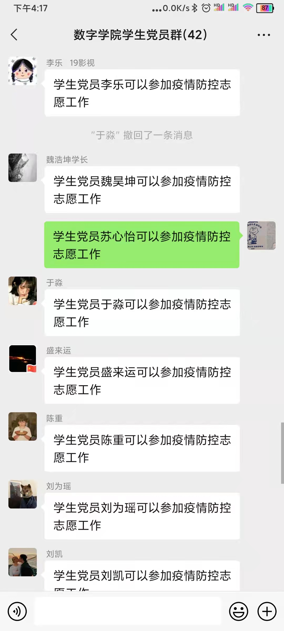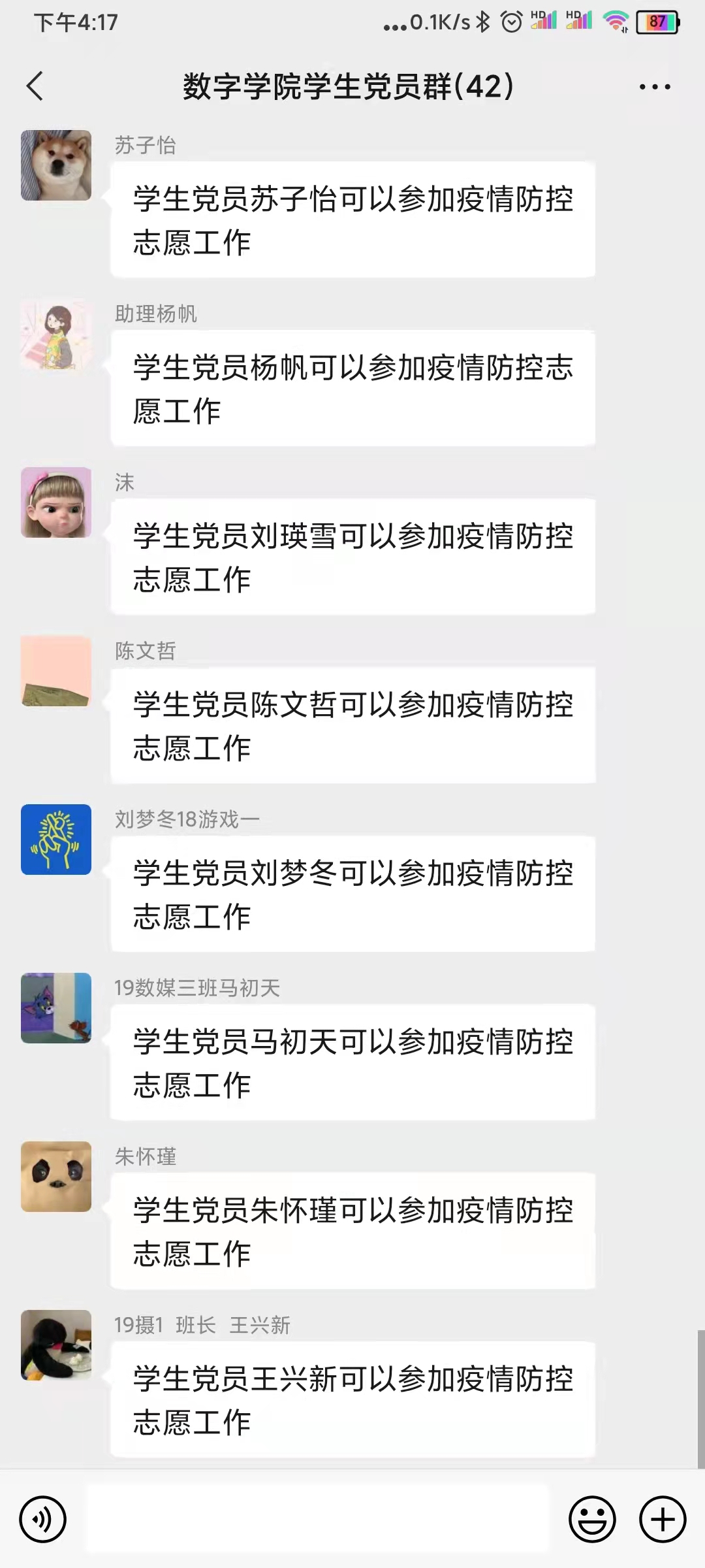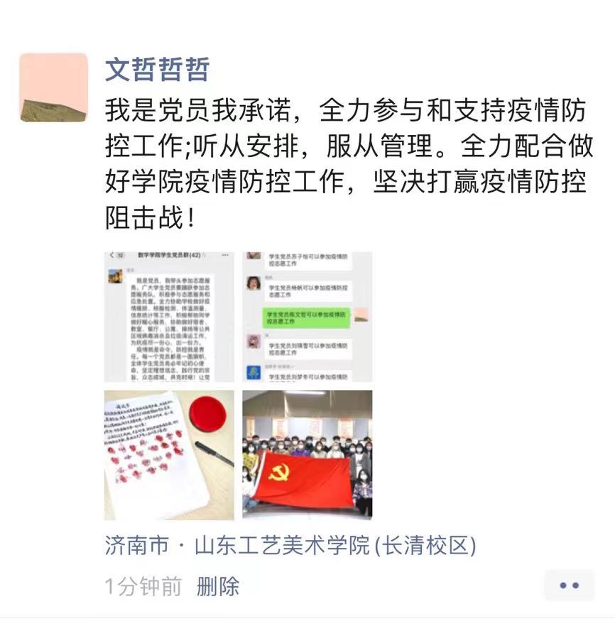 近日,我院学生党员纷纷在网上发声。我是党员我承诺,全力参与和支持疫情防控工作;听从安排,服从管理。全力配合做好学院疫情防控工作,坚决打赢疫情防控阻击战!