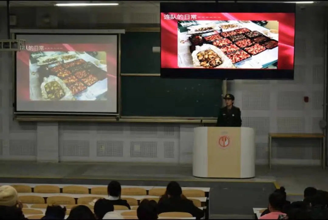 活动伊始,白春草同学介绍了自己的入伍初心,向同学们展示了连队丰富多彩的生活。从刚开始的新兵锤炼、满身是伤到后来和战友们一起参加军营里举办的各种活动,虽训练艰苦,训练时满身是伤,但都是自己一路走来的光辉勋章。