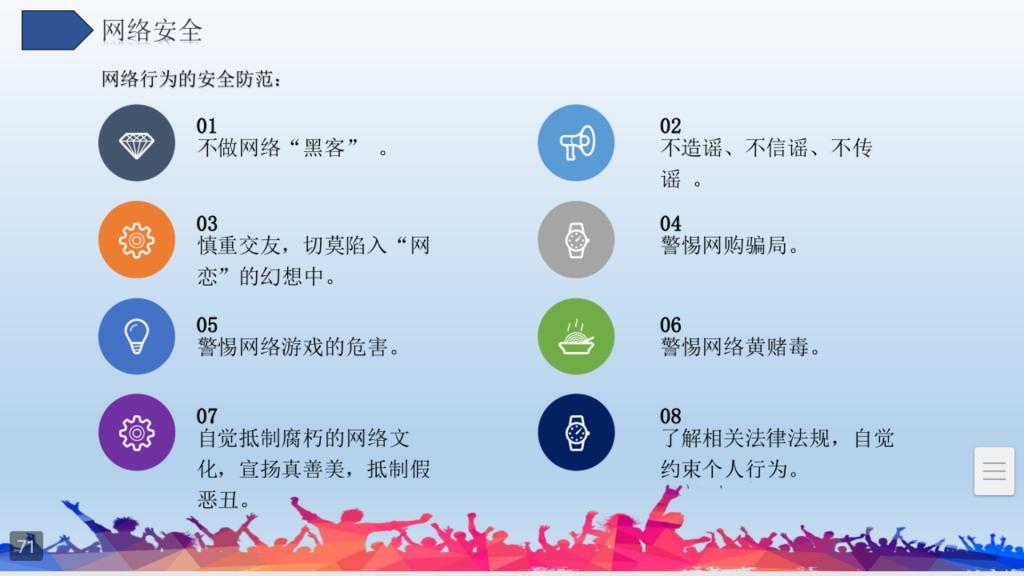 本次班会的内容包括两部分,第一部分是学习永利官网保卫处制作公布的《大学生安全健康教育》文件。在班长带领下,全班同学共同学习了安全健康教育的几个重要板块,包括“防盗窃”、“防抢劫”、“防诈骗”、“防滋扰”、“消防安全”、“交通安全”和“网络安全”七个方面。通过学习,同学们了解了各类不法侵害的常见手段以及一些预防措施,掌握了在面对危险情况时如何采取灵活的方式迅速寻求帮助。在提高自我防护能力的同时,同学们还认识到自己也要知法守法,既不能侵犯别人的合法权益,也能够以法为武,保护自身的合法权益。