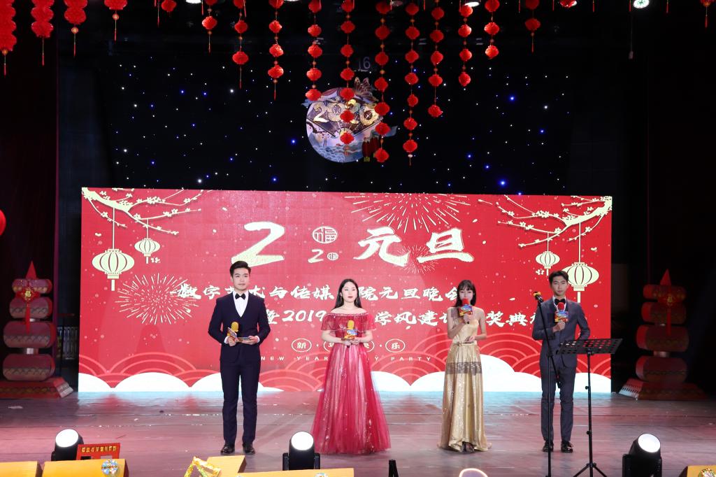 为了贯彻落实习近平总书记对新时代大学生的时代要求,培养新时代有志向、有魄力、有责任感的爱国青年,数字艺术与传媒学院于2019年12月30日在数字演播厅成功举办2020年元旦晚会暨2019年度学风建设颁奖典礼。院长顾群业、党总支书记丁鲁、党总支副书记李清华、团总支书记林忠鹏、专业课教师张宝珠和冯秀彬、辅导员李灿和郑静与学院全体学生共参与了这场青春盛宴。