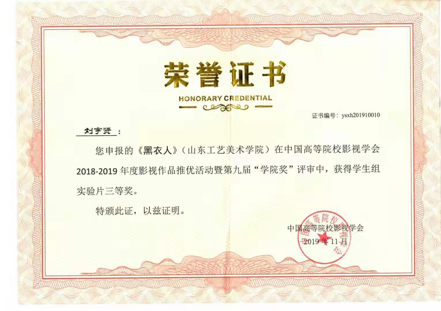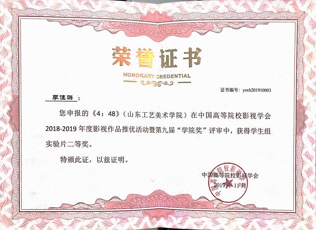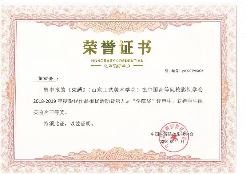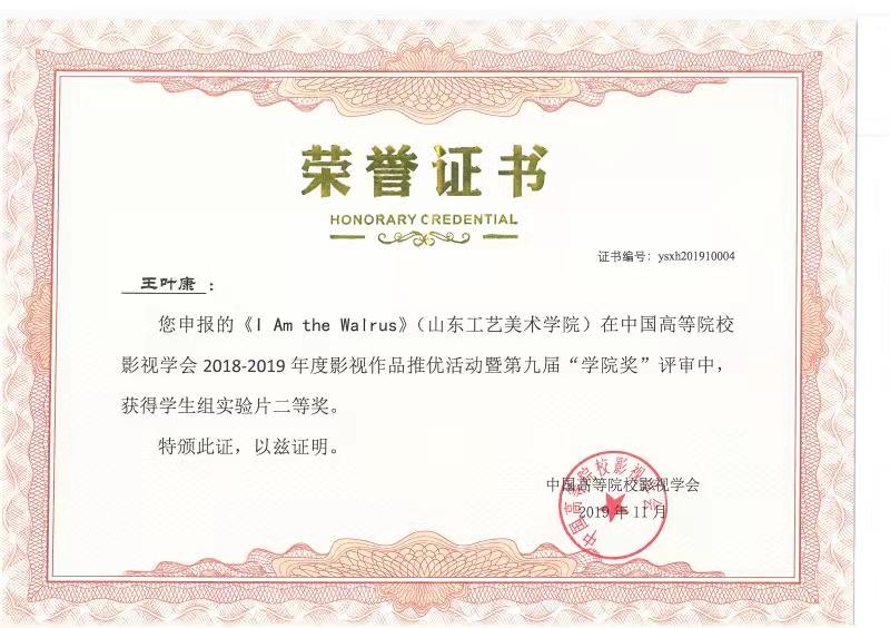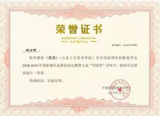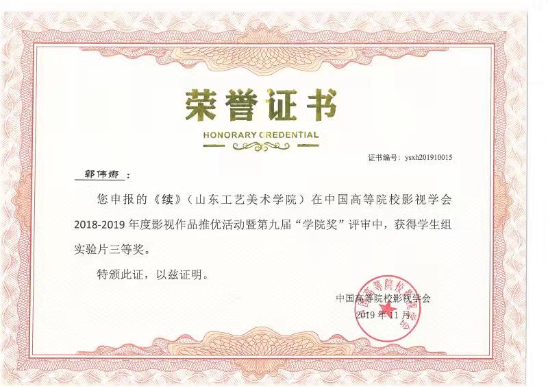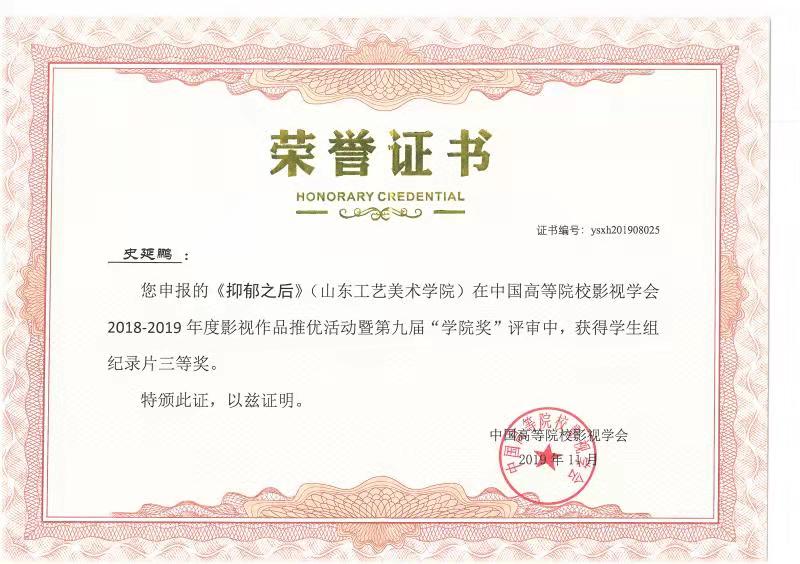 由永利官网动画专业教师张克博创作的动画短片《追梦》获得中国高等院校影视学会2018-2019年度影视作品推优活动暨第九届“学院奖”教师组二等奖;动画专业教师艾琳创作的动画短片《圆梦》获三等奖。由2015级影视摄影与制作专业学生魏仕卿、任红创作的《孤旅》获得学生组实验片一等奖,李佳璐、孙增庆、李艳秋创作的《4:48》、王叶康创作的《I am the walrus》获得二等奖;李泳震、张琛妮创作的《你和你》、郭伟娜、欧萍创作的《续》、刘宇贤、龙宗威、厉彦胜创作的《黑衣人》、董西贵、肖婷创作的《束缚》获得三等奖。由2016级学生史延鹏、王亚文、马伟、李新华、谢亦忱创作的纪录片《抑郁之后》获得纪录片三等奖。