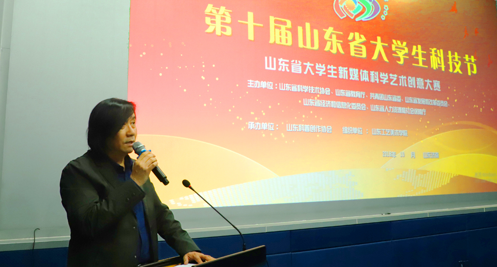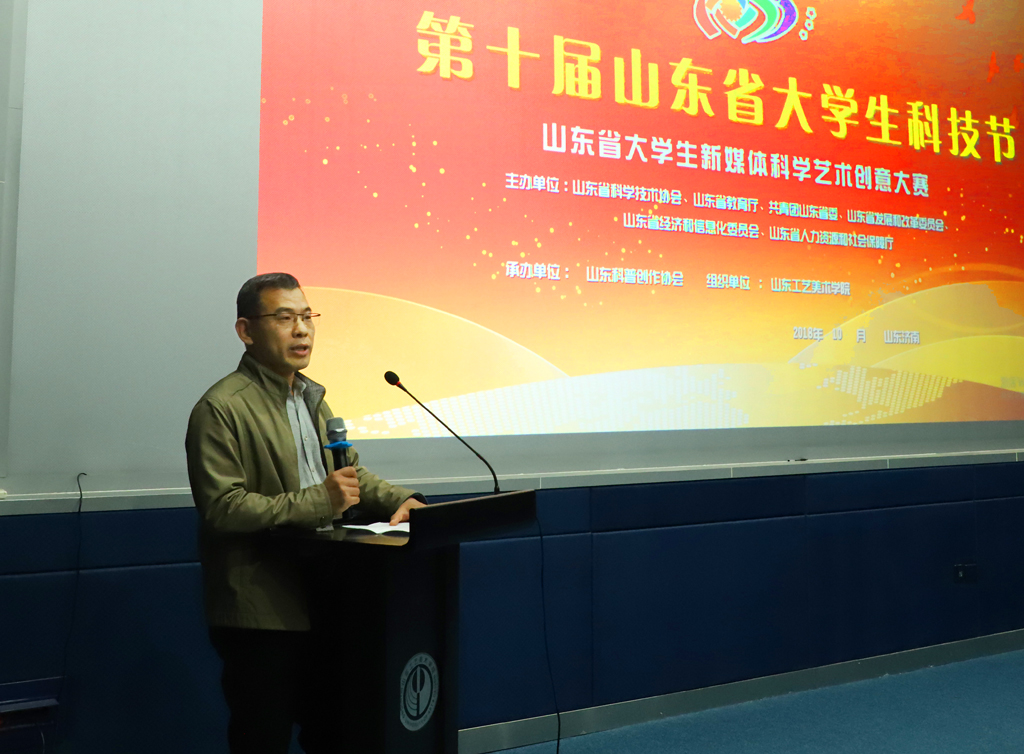 刘利印在致辞中指出,举办科技节的目的,就是在高校学生中营造“热爱科学,勇于创新,敢于竞争”的科技文化氛围,丰富教学实践和教学模式,提升大学生创新创业意识和实践创新能力,促进大学生人才成长,成就青年才俊创业发展。今年是山东省科普创作协会连续第三年举办科技节赛事,新媒体科学艺术创意大赛具有自己鲜明的特色,是科学与艺术的充分结合,通过大赛,提升了参赛选手的理论知识和创新思维,加强了相互间的交流与合作,发现了一批有潜力的优秀选手。科技节赛事无论从层次规模、社会影响,还是竞争质量、取得成果都有了显著的提升。