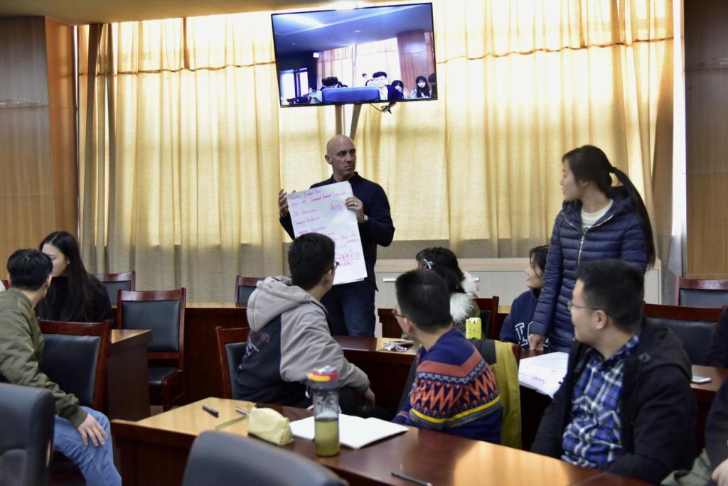 在热烈的讨论中,学生们逐渐打开思路,Damien 老师在与学生的互动中,不知不觉已将知识点渗透到学生心里。此次“工作坊”体验,不但学生们开拓了视野,了解到英国大学的教学方式,也为学校的课程改革提供了思路。