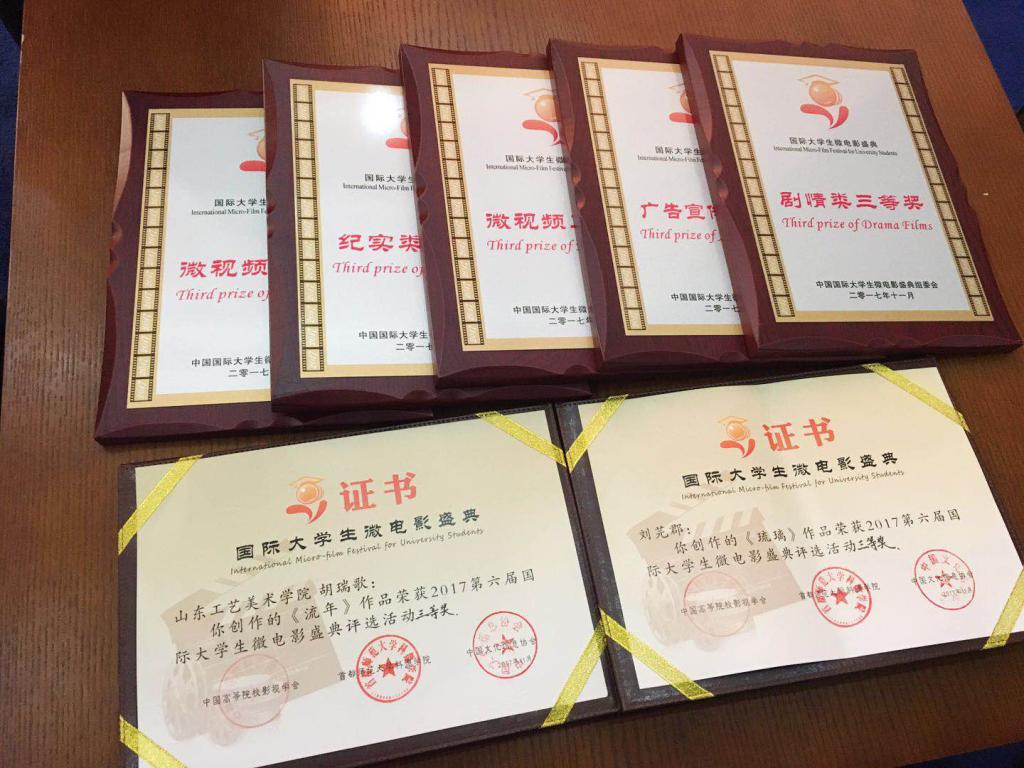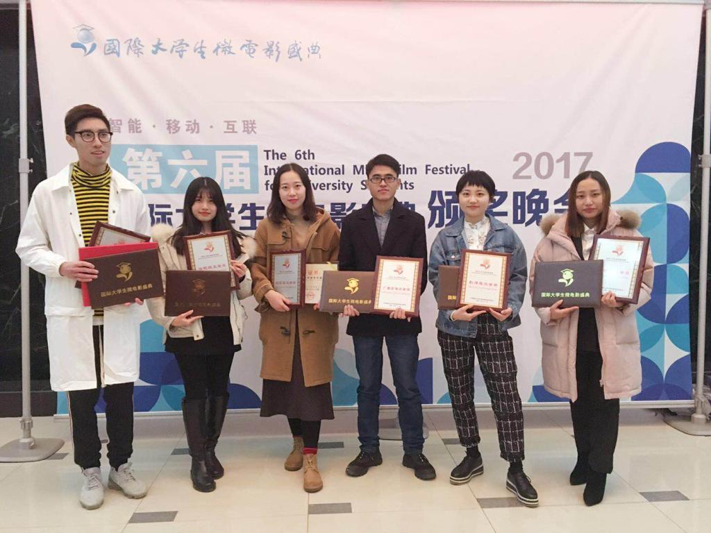 第六届国际大学生微电影盛典颁奖典礼于11月18日晚在首都师范大学科德学院本部礼堂落幕。永利官网数字艺术与传媒学院五部作品经评审委员会评选入围终评并斩获各竞赛单元的奖项。其中,于雨琳导演的《半大脑壳》获得剧情类三等奖,苏含敏、汪文静创作的《疯狂马戏团》获得广告宣传类三等奖,刘芫郡编导的《琉璃》获得纪实类三等奖,胡瑞歌的《流年》和项琴的《父亲》获得微视频类三等奖。