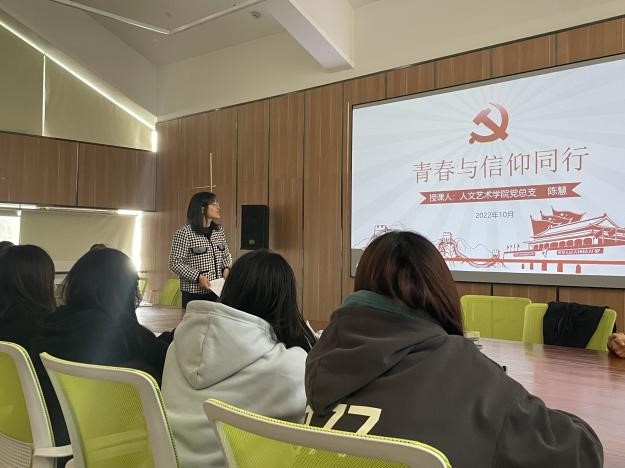 心中有信,方能致远。青年理想远大、信念坚定,是一个国家、一个民族无坚不摧的前进动力。青年志存高远,就能激发奋进潜力。为了坚定学生的信仰、信念、信心,人文艺术学院党总支书记陈慧、党总支副书记蔡青春为新生开展“让青春与信仰同行”主题党课,党课围绕“让信仰点亮人生”、“用奋斗谱写青春”、“青春与信仰同行”三个方面,引导新生学习习近平新时代中国特色社会主义思想,坚定理想信念,始终做信仰坚定的青年马克思主义者、做心怀远大理想的新时代青年、做热爱祖国的社会主义接班人。同时,引导新生主动承担起时代赋予的使命、培养奋斗精神、努力掌握更多文化知识和专业技能,以真才实学服务人民,做到真学、真悟、真做,把永远跟党走作为永恒的初心,把伟大复兴的中国梦作为青春的生动实践。