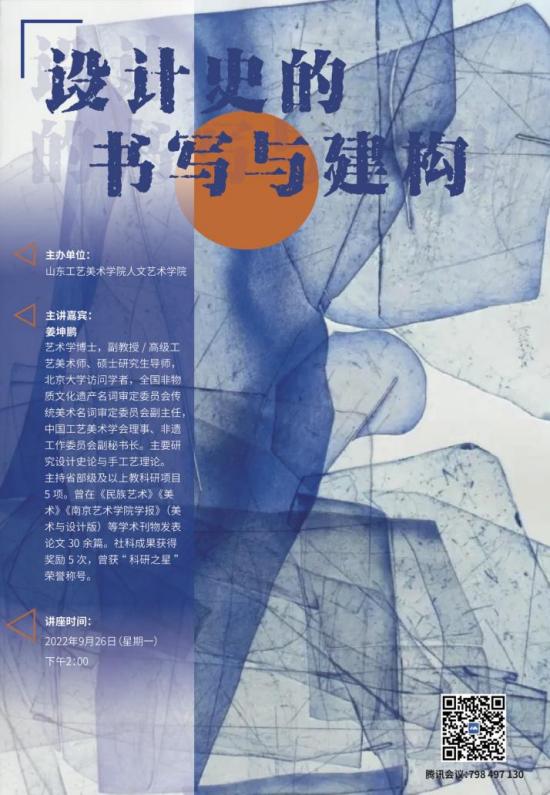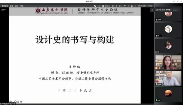 2022年9月26日,根据活动进度安排,我院如期举行了第四场线上讲座,期间邀请山东艺术学院副教授、高级工艺美术师、中国工艺美术学会理事姜坤鹏教授做了题为《设计史的书写与建构》的讲座。人文艺术学院院长徐磊教授介绍了姜坤鹏教授的学术履历和相关研究成果,代表学院表达了对姜教授的欢迎和谢意。设计学教研室教师及校内外相关专业的学生共同参与了本次活动。