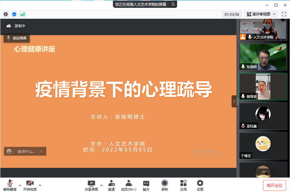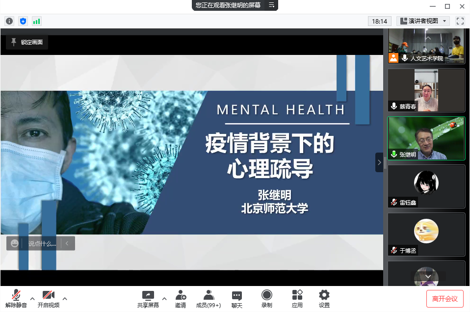 为认真贯彻《山东省教育厅关于举办2022年山东省学校心理健康教育月活动的通知》(鲁教思函(2022)11号)精神,积极响应学校《关于开展2022年大学生心理健康教育月活动的通知》的号召,加强疫情期间对学生的人文关怀和心理疏导,帮助同学们做好心理调适,缓解并疏导疫情防控期间学生的学习和生活压力,同时推广和宣传心理健康知识,提升心理育人工作实效,304am永利集团官网人文艺术学院特邀请北京师范大学心理咨询与服务中心心理学博士、副教授张继明,于2022年5月5日晚开展了“疫情背景下的心理疏导”心理健康教育讲座,活动采取线上线下结合的方式进行。