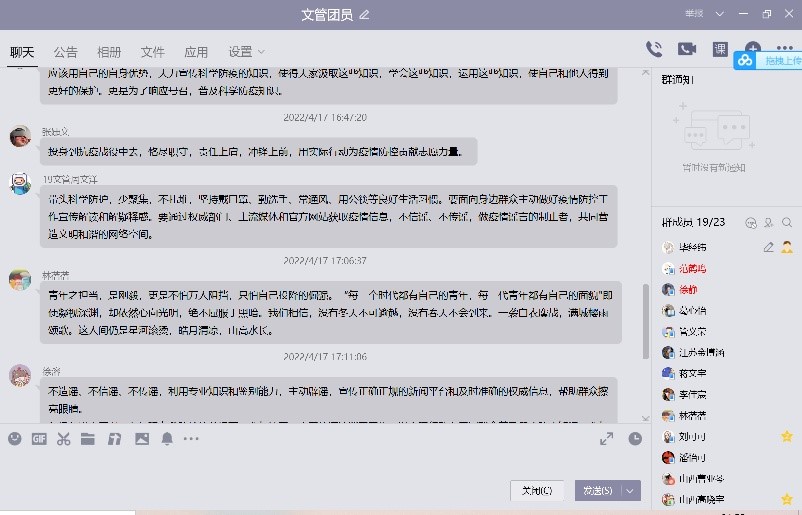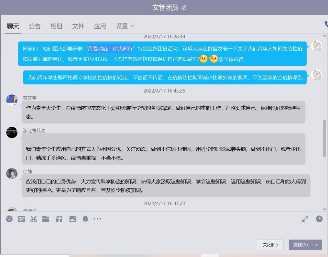 本次活动中,各团支部以线上形式“齐聚一堂”,分享疫情防控、抗击肺炎过程中的心得与奇妙际遇。通过解读防疫政策、防疫知识宣传,宣读承诺书(倡议书)等多种形式,全面动员广大学生,加强自我管理、自我服务、自我监督、自我提升意识,充分发挥团员先锋模范作用,自觉投身校园疫情防控阻击战。此外,在线上会议交流过程中,多个团支部成员谈及在疫情过程中学习文件的心得体会,身处疫情重灾区的成员分享自疫情发展以来自身的生活状况和对家乡、对祖国战胜疫情的信心!