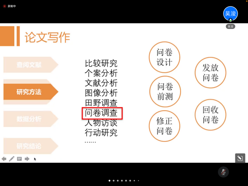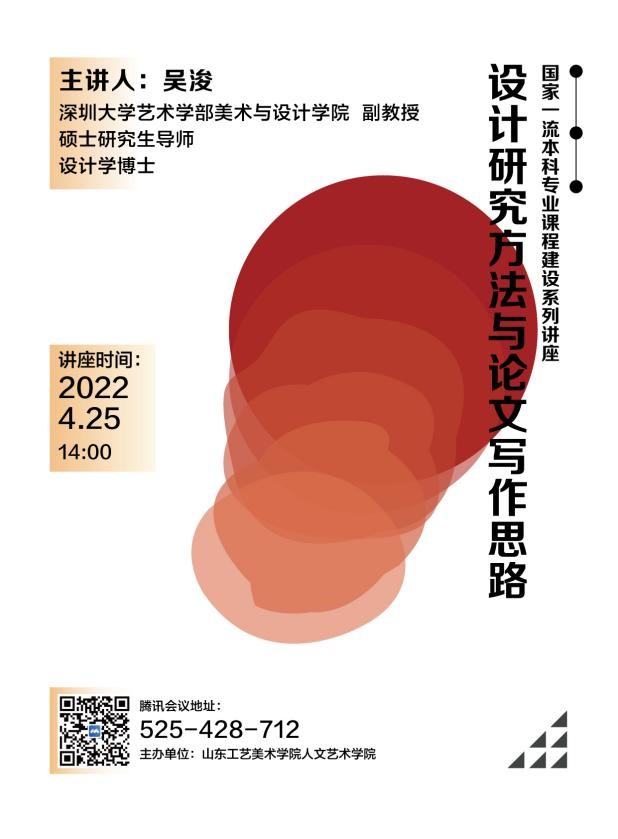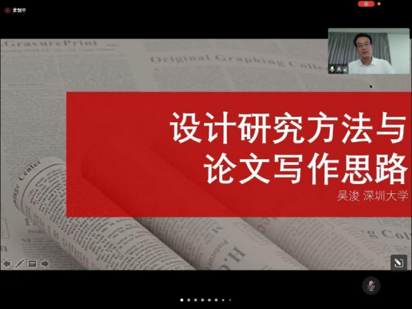 2022年4月25日下午,“国家一流本科专业课程建设系列讲座”活动拉开帷幕,举办了第一场线上讲座。本场讲座的主讲嘉宾为深圳大学艺术学部美术与设计学院副教授、硕士研究生导师、设计学博士吴浚,讲座主题为《设计研究方法与论文写作思路》。设计学教研室全体教师及校内外相关专业的学生共同参与了本次讲座活动。