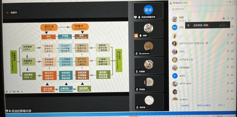 主题讲座结束后,吴浚老师与参与讲座的老师、同学进行了在线交流,就学生提问的“处理数据的软件推荐”以及“风格迁移如何应用到自身创作上”等问题进行了回答。吴浚老师认为,无论是做学问还是做论文,首先要解决两大挑战问题,“研究什么”以及“如何去研究”。当确立了研究方向后,要选择适切的研究方法。最后,吴浚老师激励大家在今后的研究中做到“兴趣、求真、厚植、深耕”,当我们自身享受到创作中,便会深觉其乐无穷,受益匪浅。讲座以活泼的讲座形式、新颖的研究方法、严谨的研究程序、详细的过程解读,获得教师与学生的一致好评。