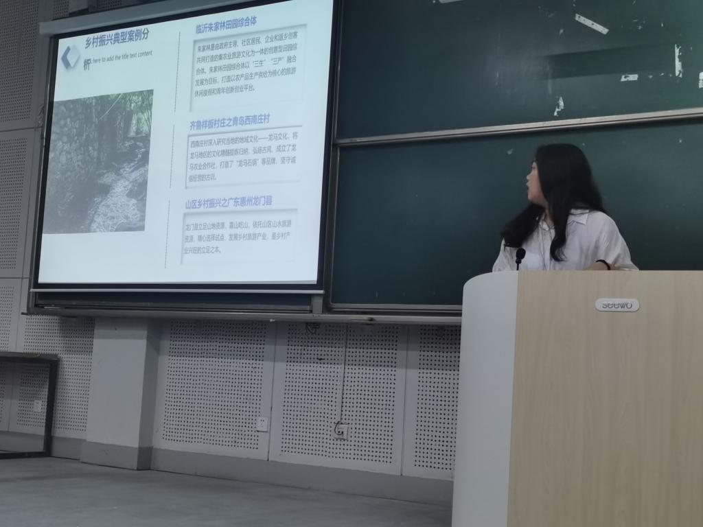 分享会上,19级助力乡村振兴路实践调研团首先分享了关于曹县的实地调研。讲解员蒋文宇向在座的同学们介绍了山东菏泽曹县华服发展的机遇和面临问题,重点就“乡村振兴”和“乡村建设”进行详细解说。随后,讲解员就本次实践经历和感悟做了分享,强调了团队合作在实践中的重要性以及将理论知识投入到社会实践的必要性。