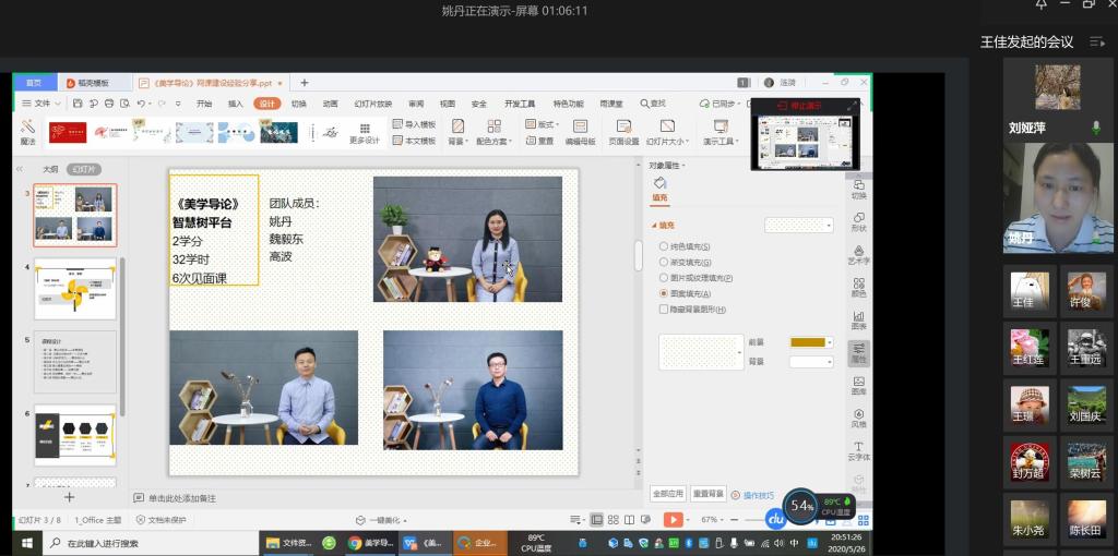 5月26日,人文艺术学院举行了优质课程培育建设经验线上分享交流会。人文艺术学院已参与省级一流课程建设与申报工作的三位老师姚丹、徐小宁、王佳参加了交流会,会议由刘娅萍主持。