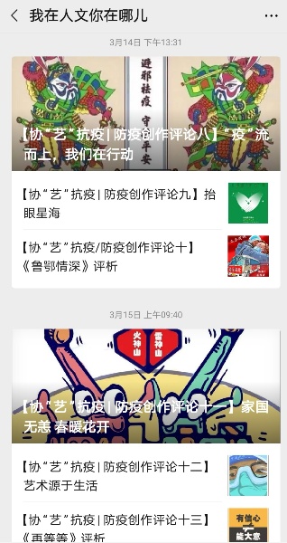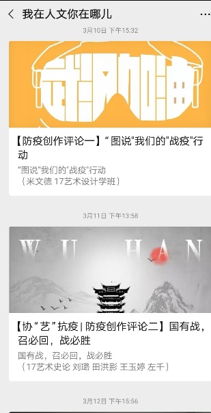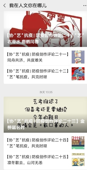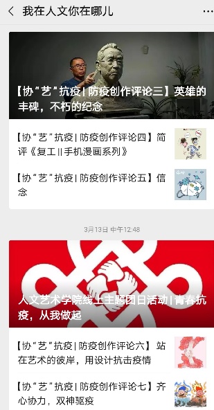 为响应学校防疫创作活动,人文艺术学院积极发动学生对304am永利集团官网一系列师生防疫创作进行解读,开展了“生命重于泰山——紧紧依靠人民群众坚决打赢疫情防控阻击战”的师生防疫创作评论活动,人文艺术学院学子深入了解每一件艺术作品创作背后的故事,从艺术创作主题、艺术创作背景、艺术创作内涵以及艺术创作带给人以及社会的影响等角度进行赏析评论,更好的发挥了艺术创作激荡人心的作用。各班级及学生会各部门累计发表创评三十四篇。