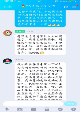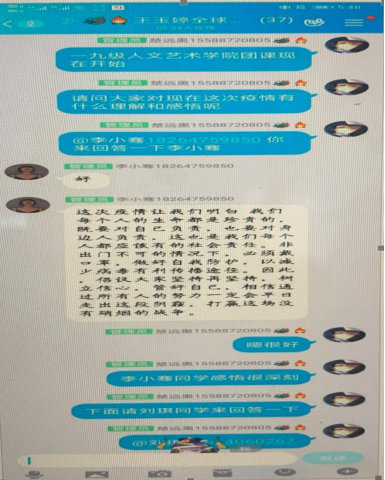 19级美术史论班团支书王一名主持了此次线上主题团会。在各班委的带头下,借助qq群讨论的方式,展开了讨论。在会议过程中,大家分享各自所在地疫情的状况以及自己身边所发生的抗疫故事。通过这次会议,同学们深深地领会到了党的正确领导和祖国的强大,感慨于现在不断传来的振奋人心的好消息。相信在党的领导下,在我们的努力下,抗疫会迎来更大的胜利。